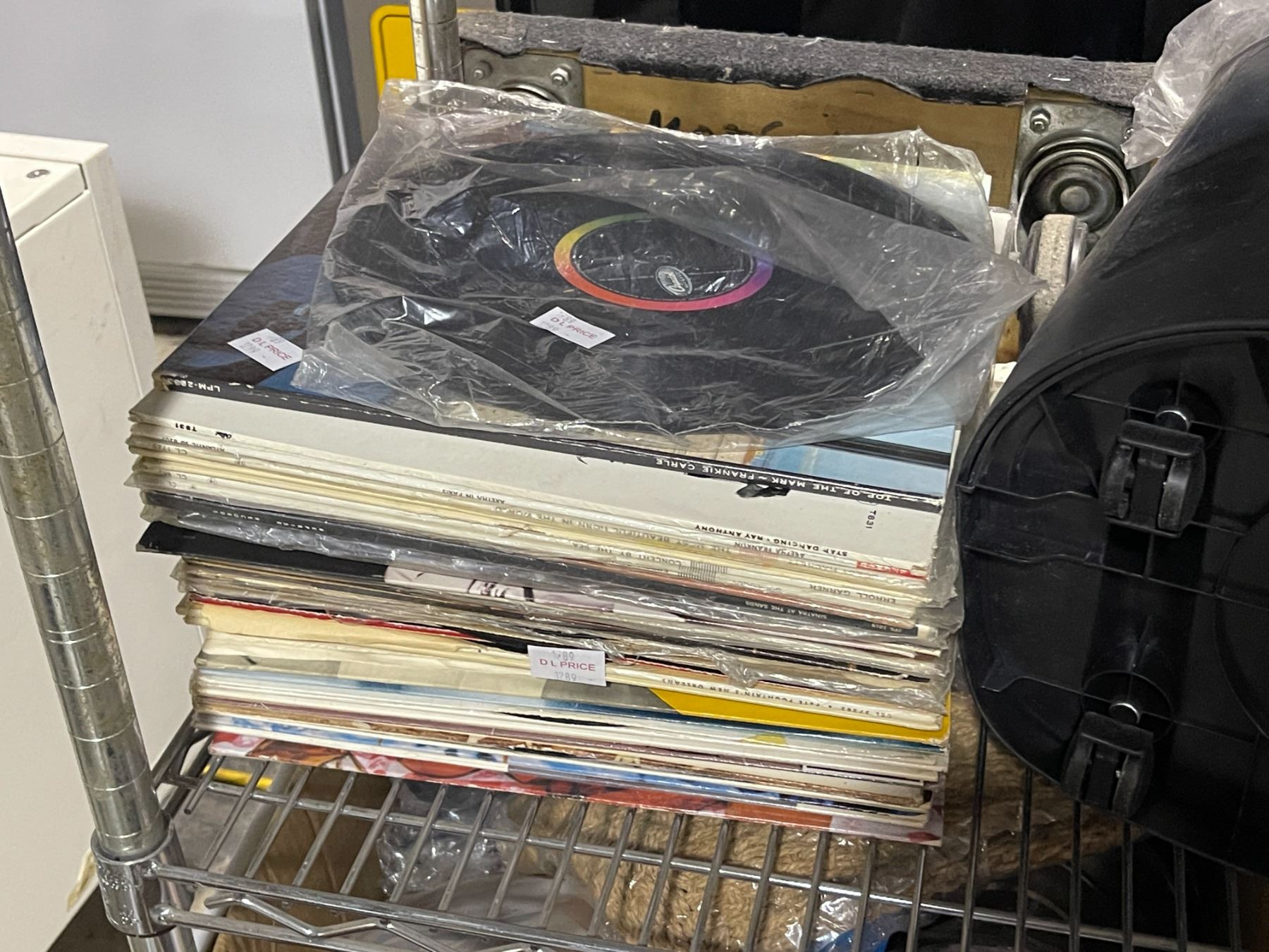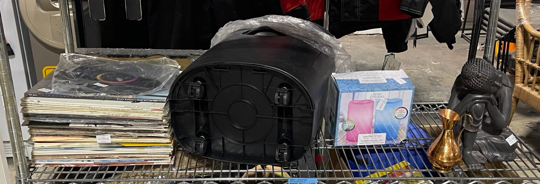 Shelf of Decor Items: Vinyl Records, Buddha Statue, Pitcher & More