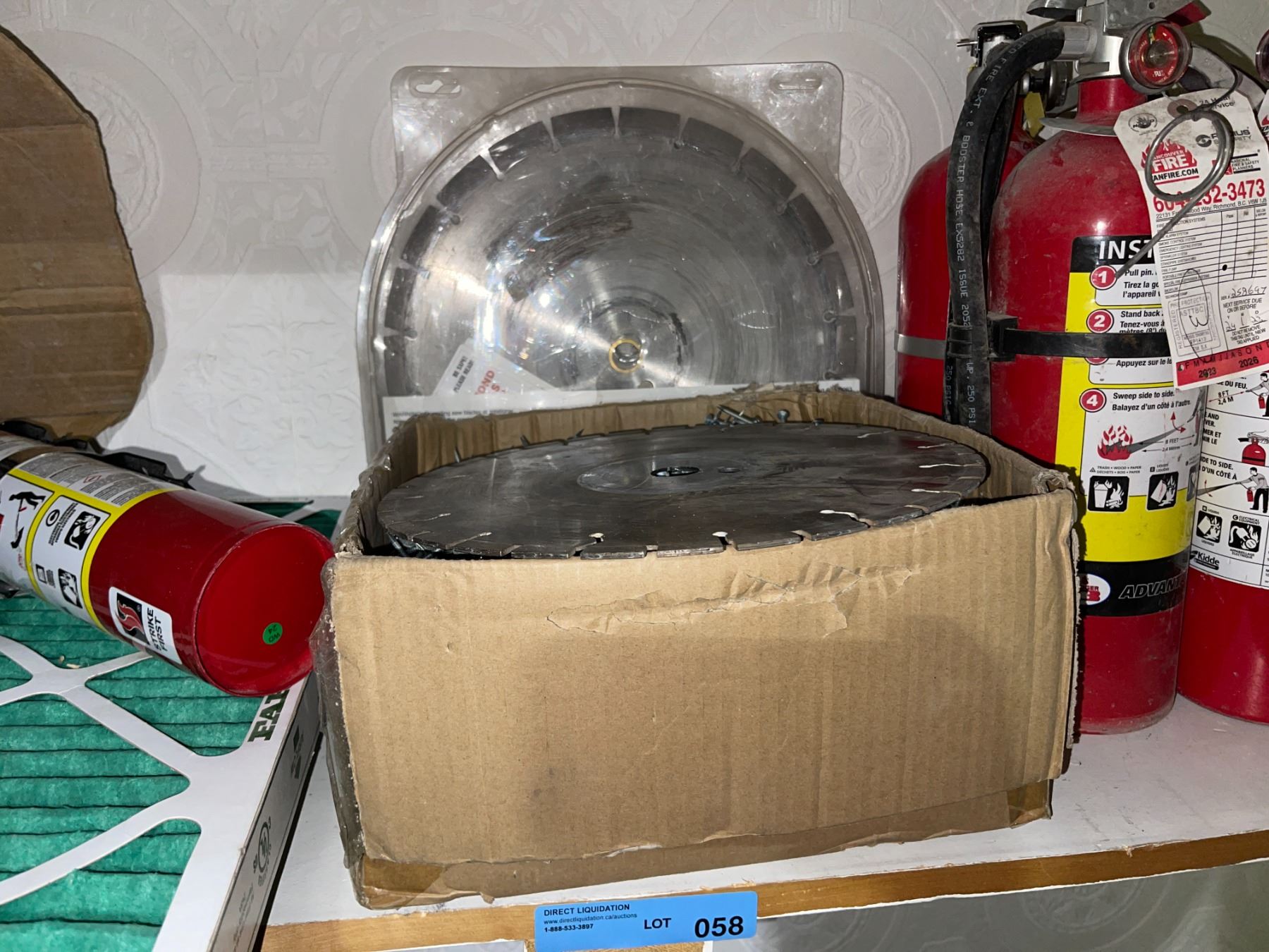 Shelf of Industrial Utility Items - Fire Extinguishers, Saw Blades, Air Filter, and More