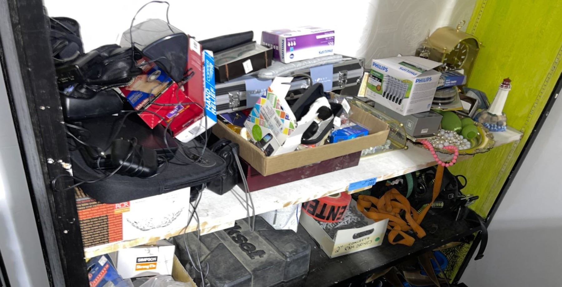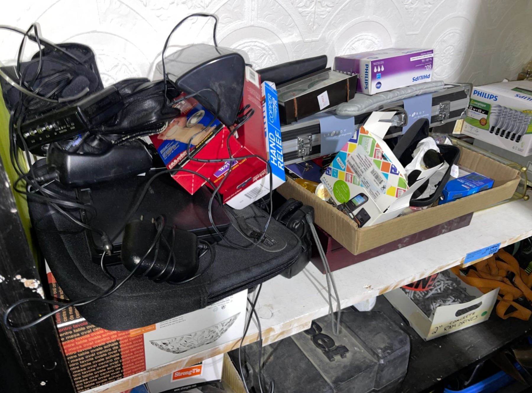 Lot 59 2-Shelf of Mixed Household & Electronics Supplies and DeLonghi Convection Oven