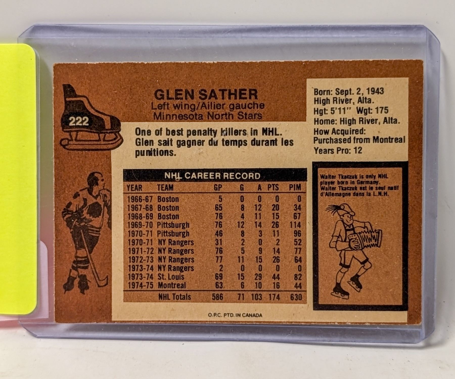 1975 OPC GLEN SATHER HOCKEY CARD