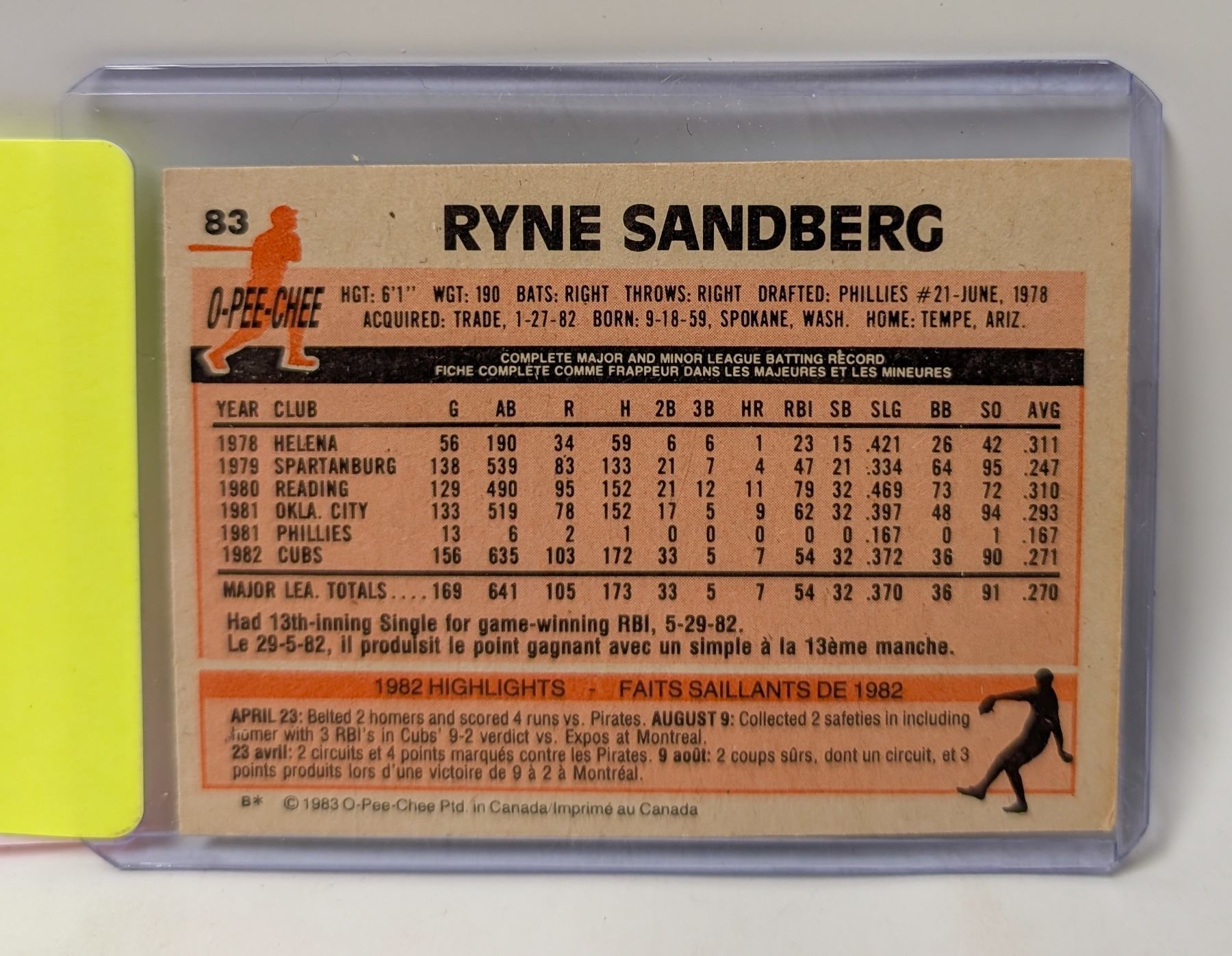 1982 OPC RYNE SANDBERG ROOKIE CARD
