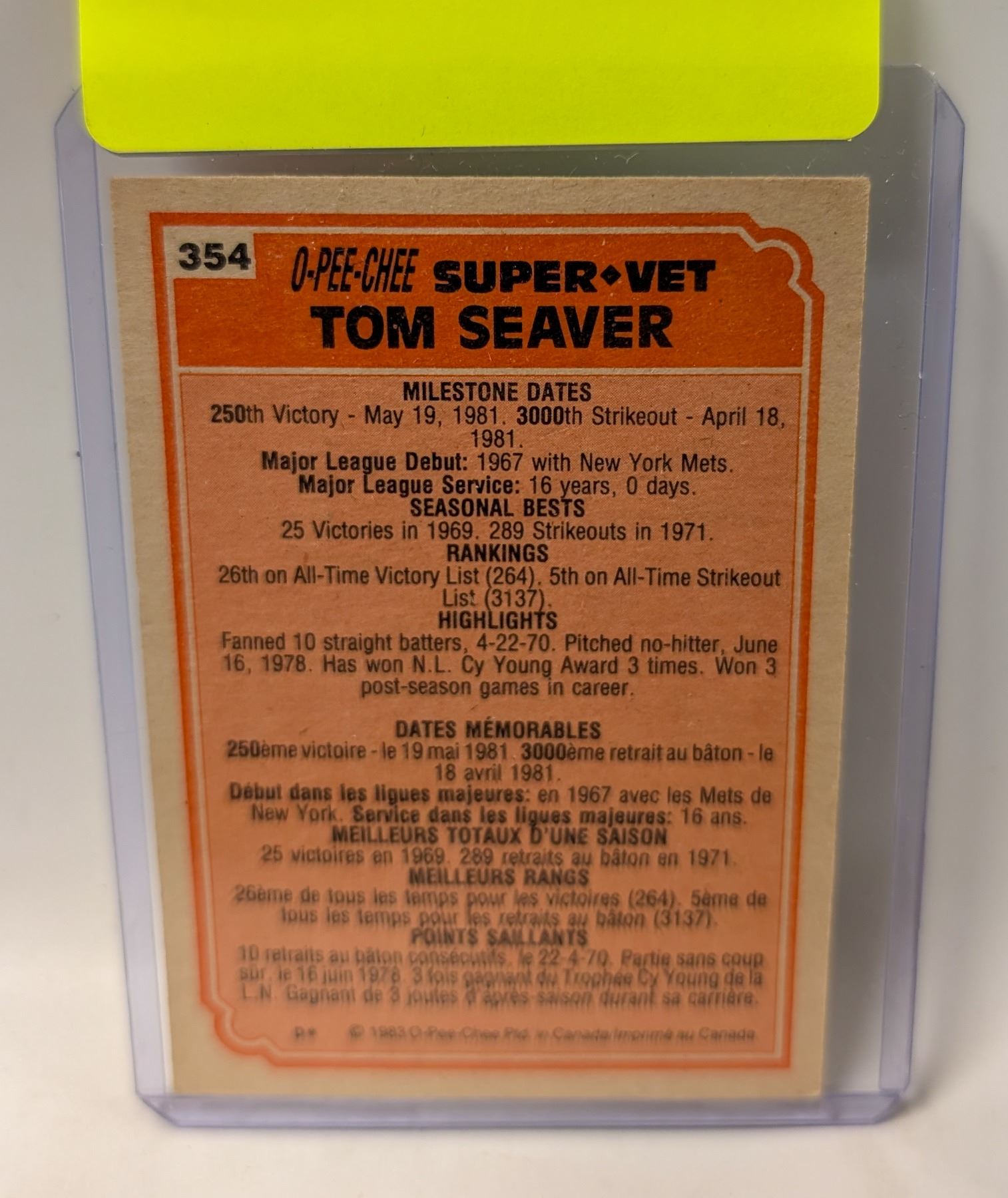 Lot 9227 1982 OPC TOM SEAVER HOF BASEBALL CARD