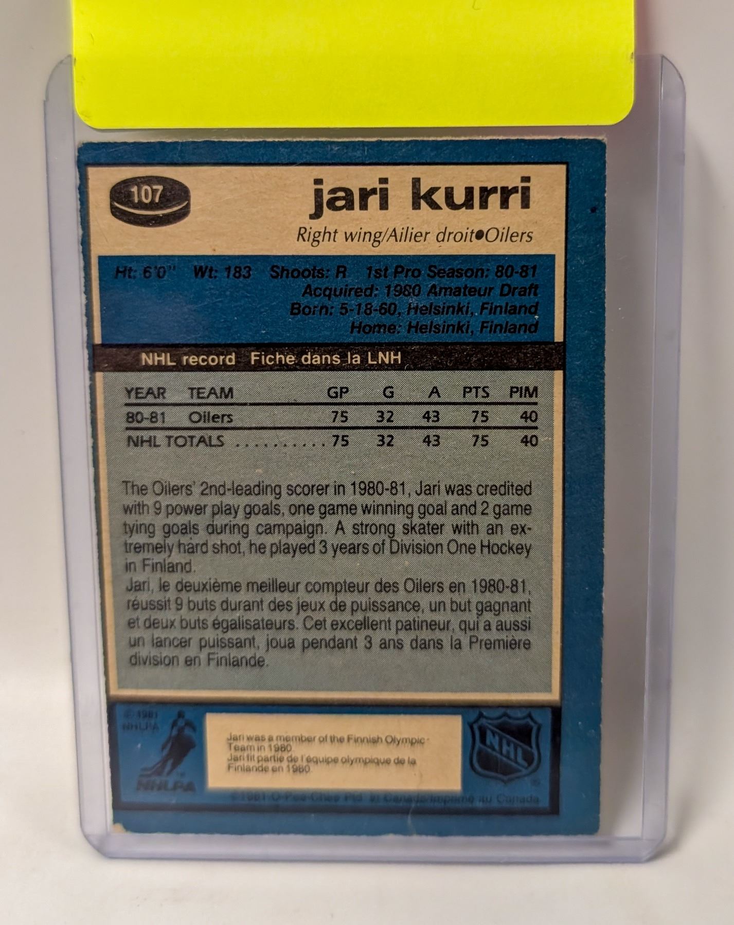 Lot 9240 1981 OPC JARI KURRI ROOKIE CARD
