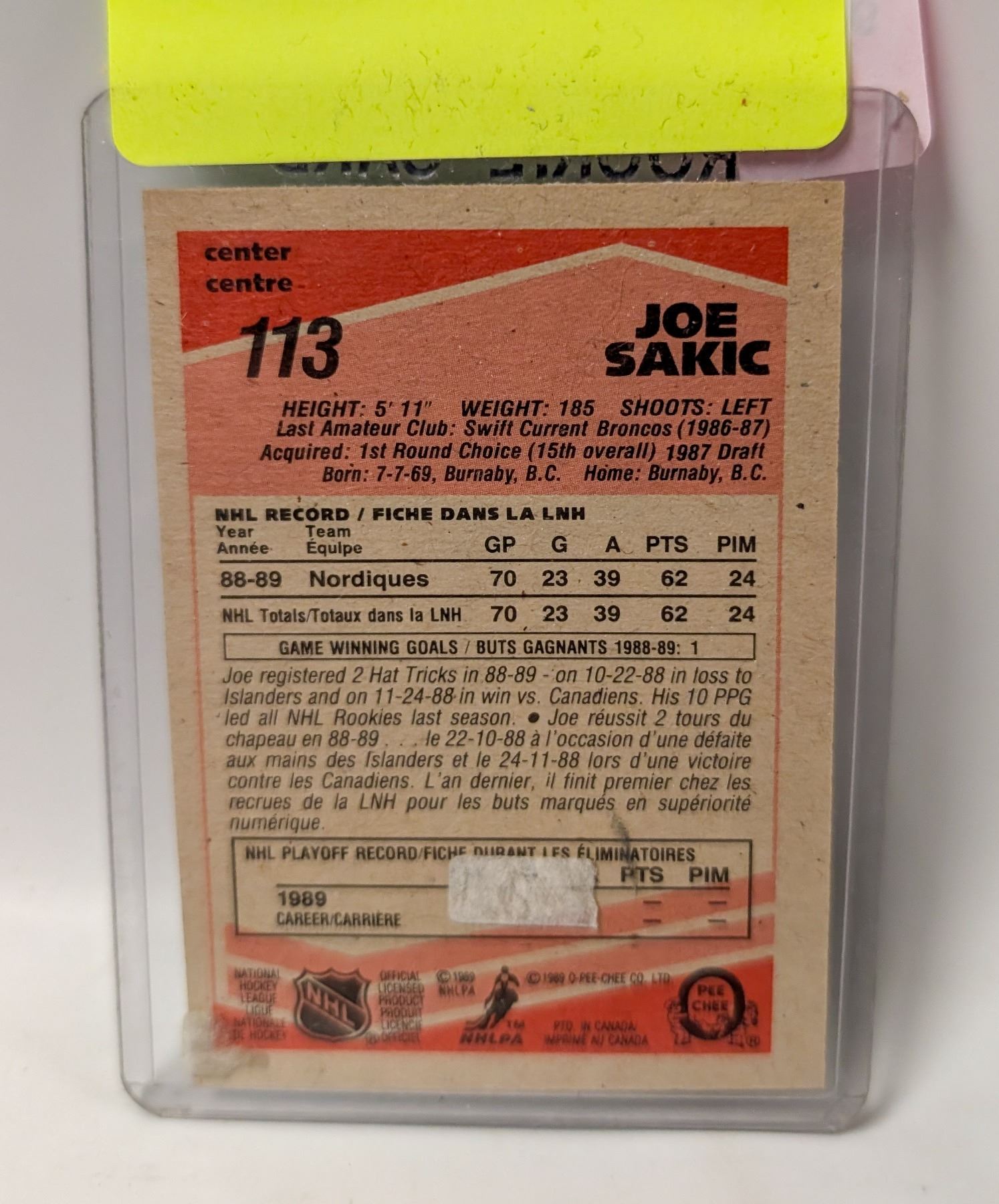 Lot 9241 1989 OPC JOE SAKIC ROOKIE CARD