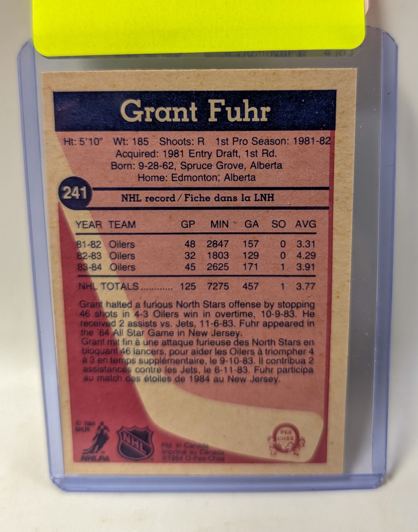 Lot 9277 1984 OPC GRANT FUHR HOCKEY CARD