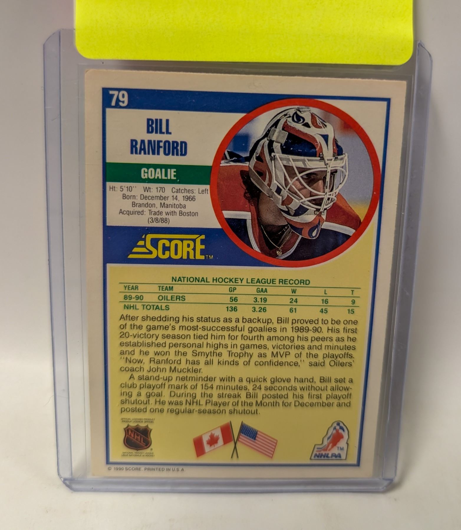 SIGNED 1991 SCORE BILL RANFORD HOCKEY CARD