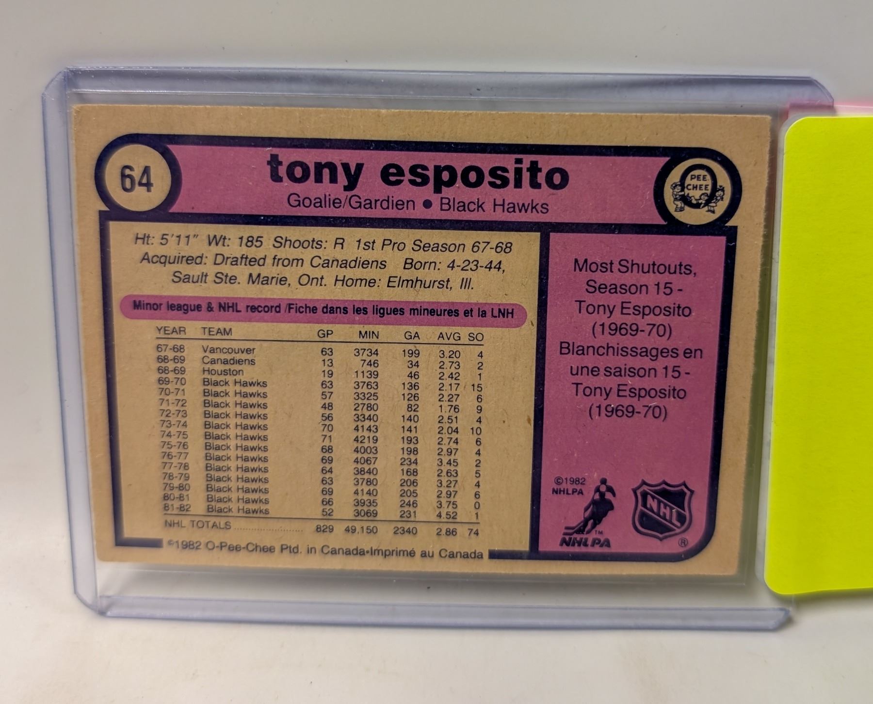 Lot 9291 1982 OPC TONY ESPOSITO HOCKEY CARD