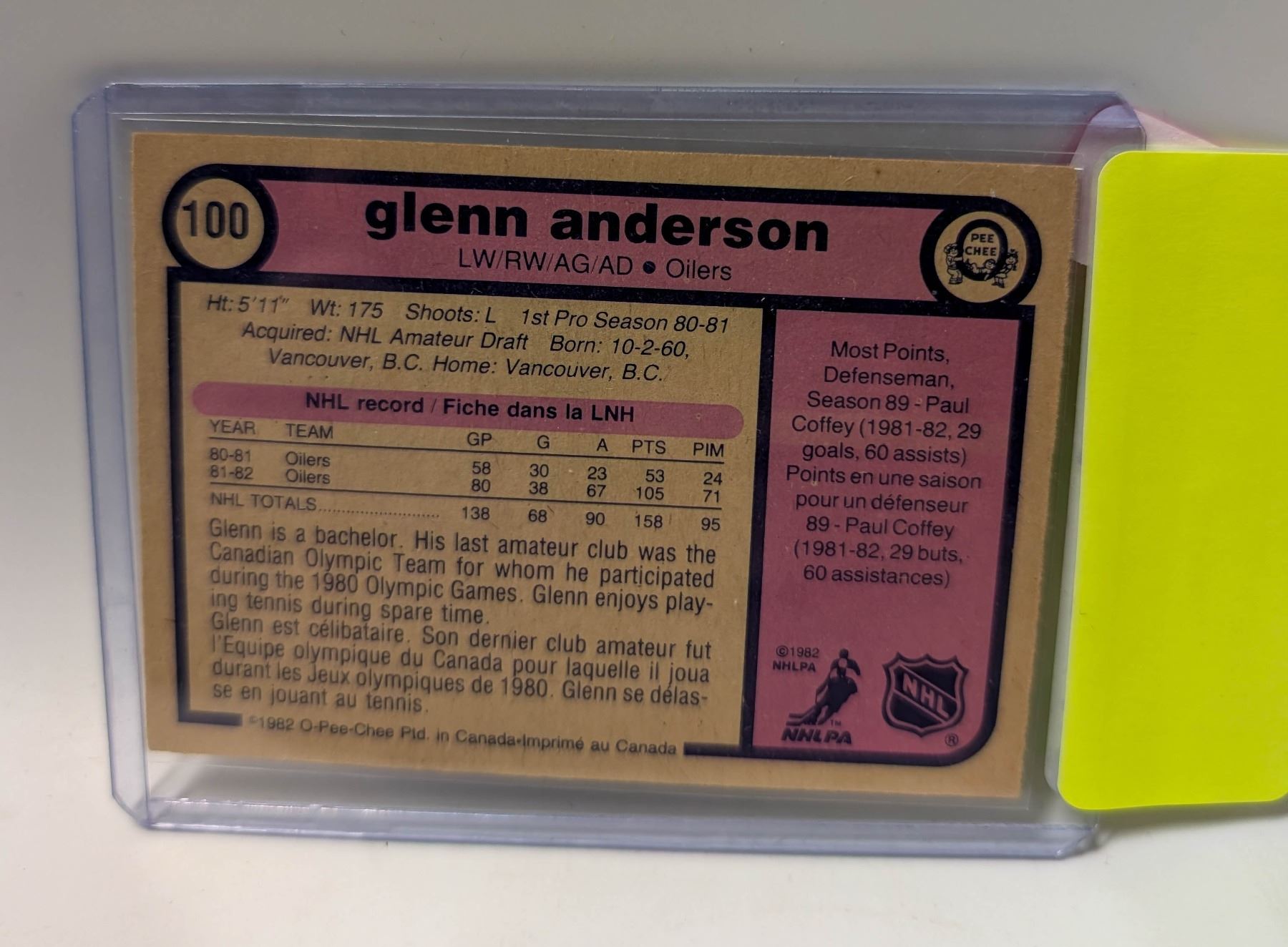 Lot 9312 1982 OPC GLENN ANDERSON HOCKEY CARD 100
