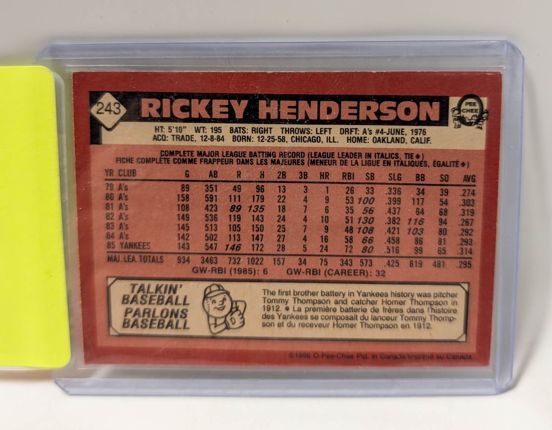 Lot 9320 1986 OPC RICKEY HENDERSON BASEBALL CARD