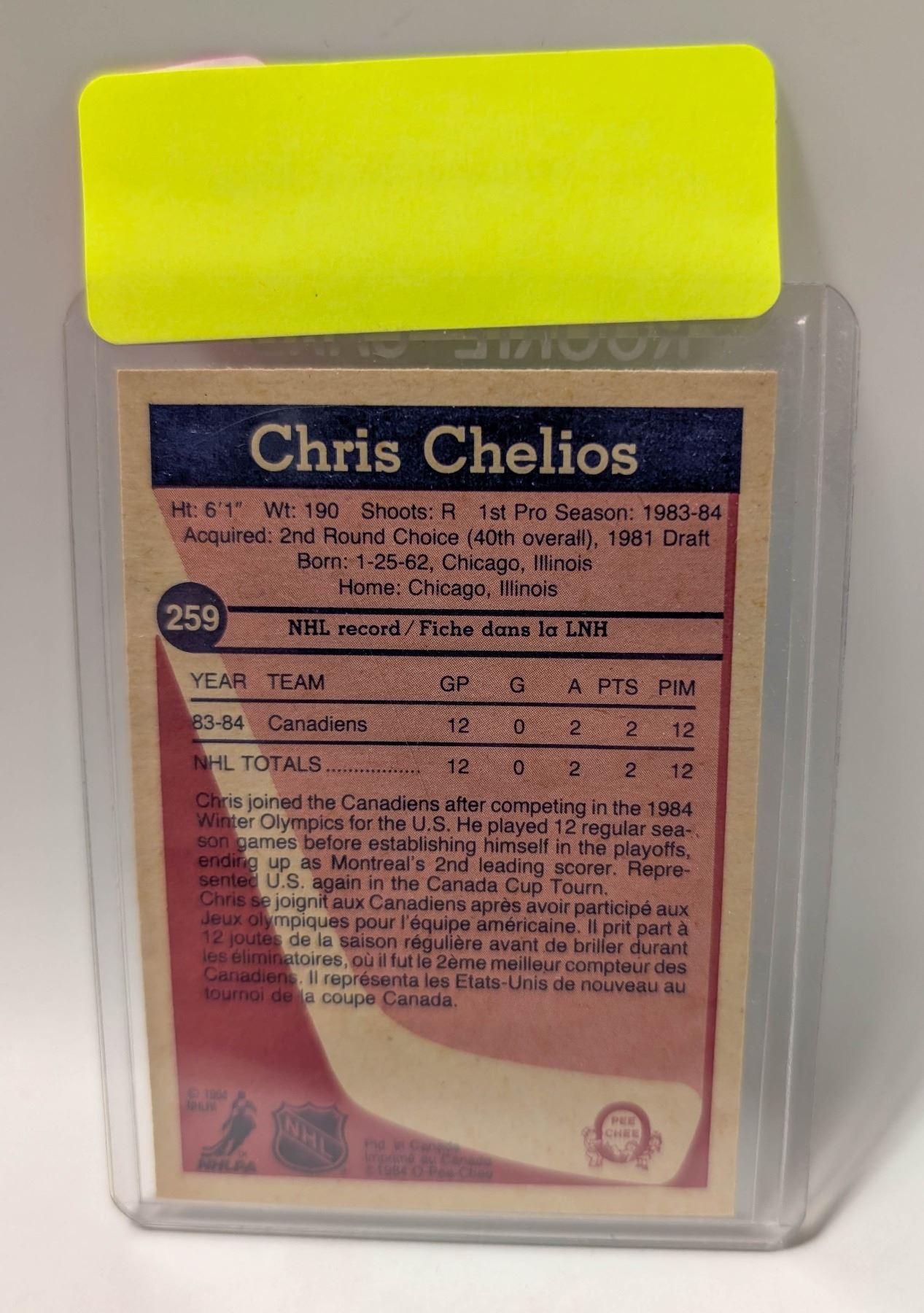 Lot 9321 1983 OPC CHRIS CHELIOS ROOKIE CARD
