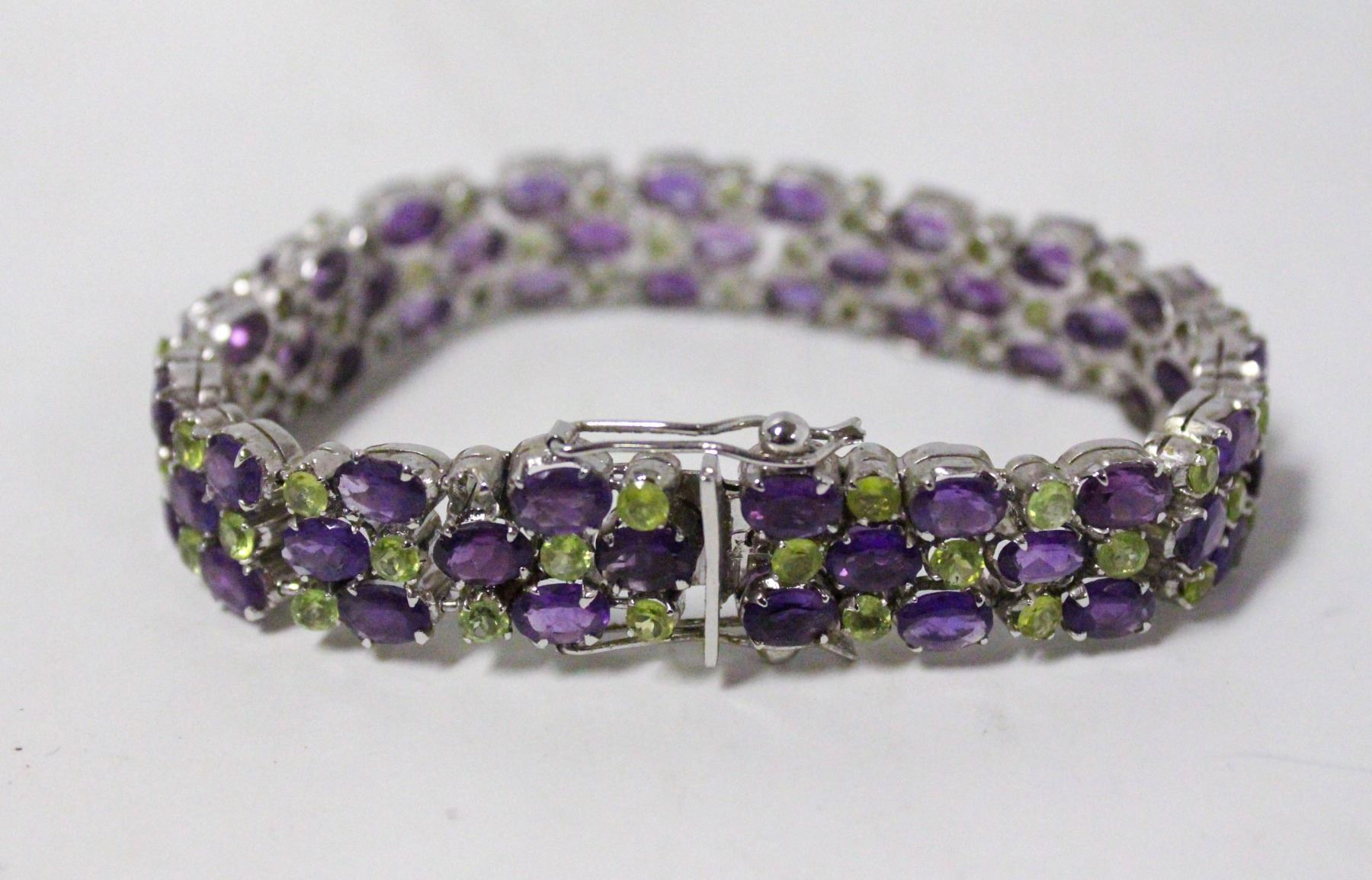 Lot 9367 925 SILVER TENNIS BRACELET W AMETHYST & PERIDOT