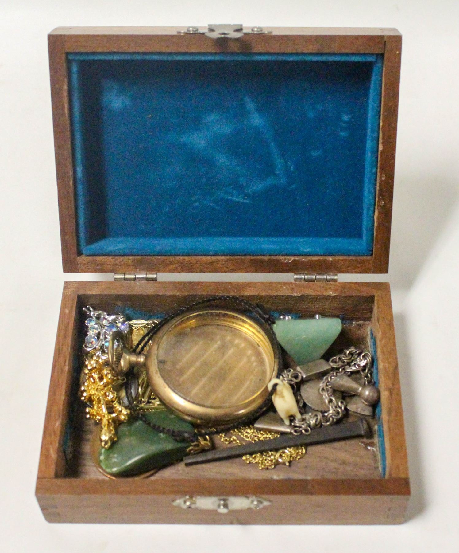 WOOD BOX OF ASSTD COLLECTIBLES