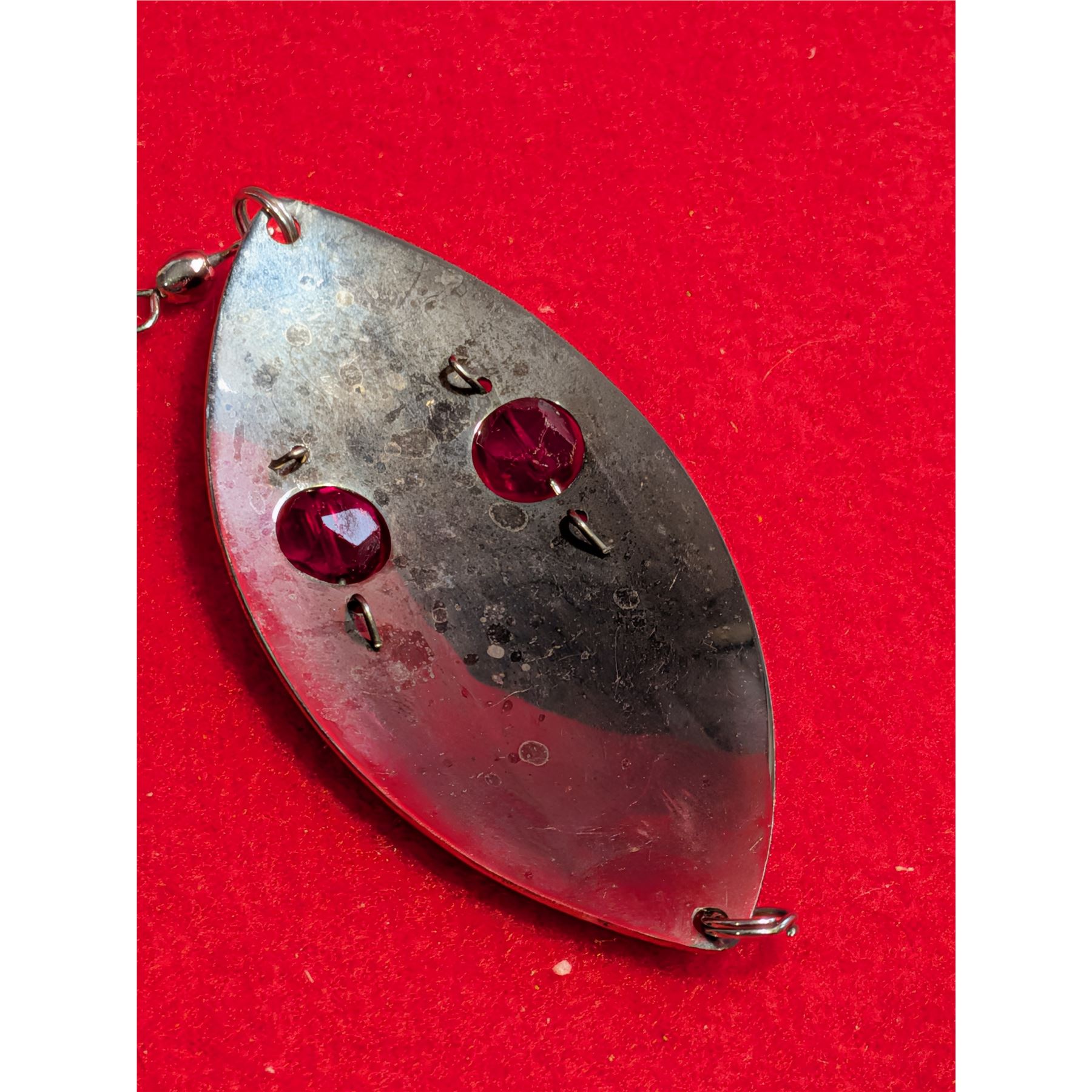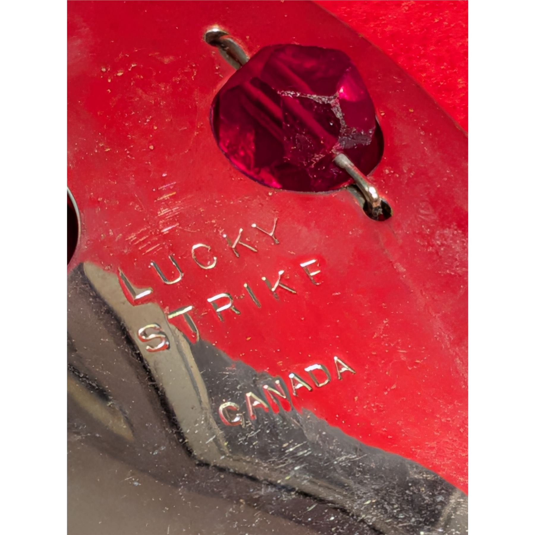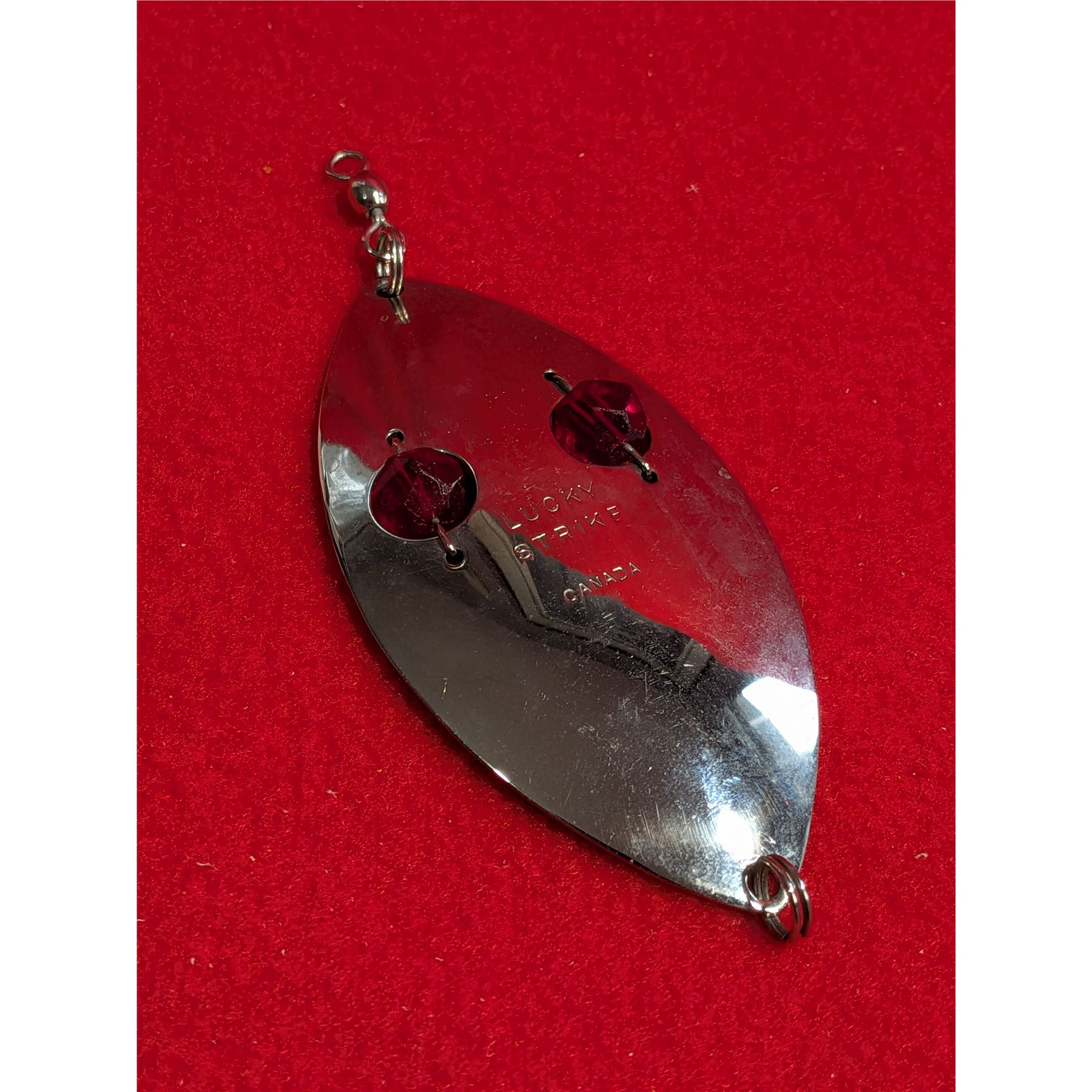 Vintage Lucky Strike Red Flash Wiggler Spoon, a popular Canadian-made fishing lure featuring distinctive red bead eyes.