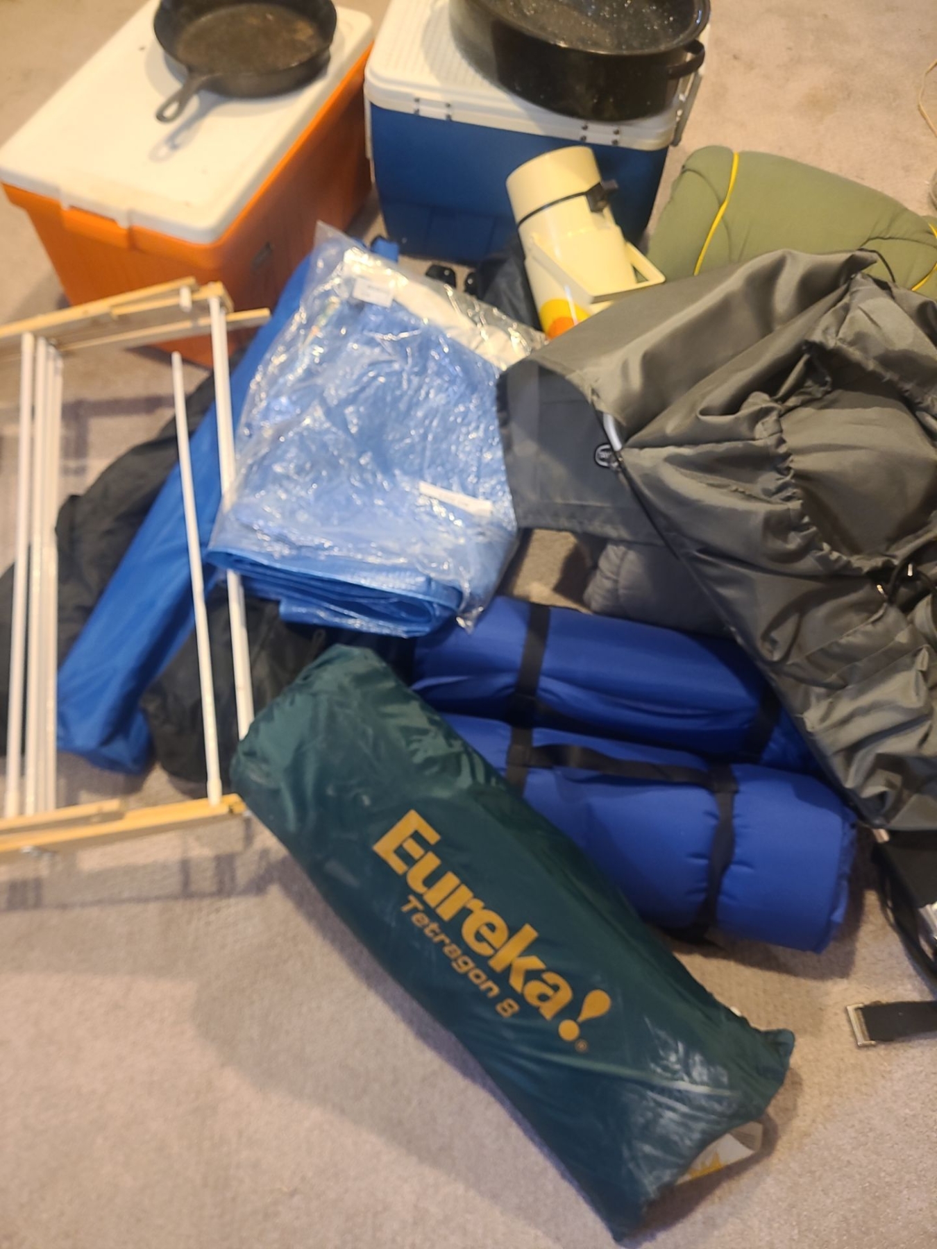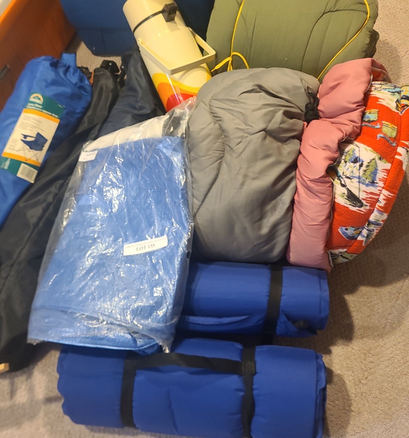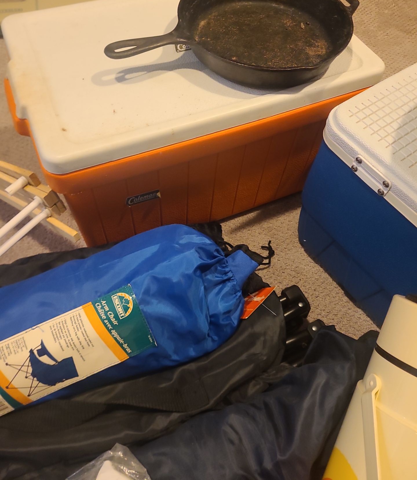 Lot 135 Coolers, Sleeping Bags, Folding Chairs, Mats, Tarps Backpack, Cast Iron Frying Pan & Eureka Tent