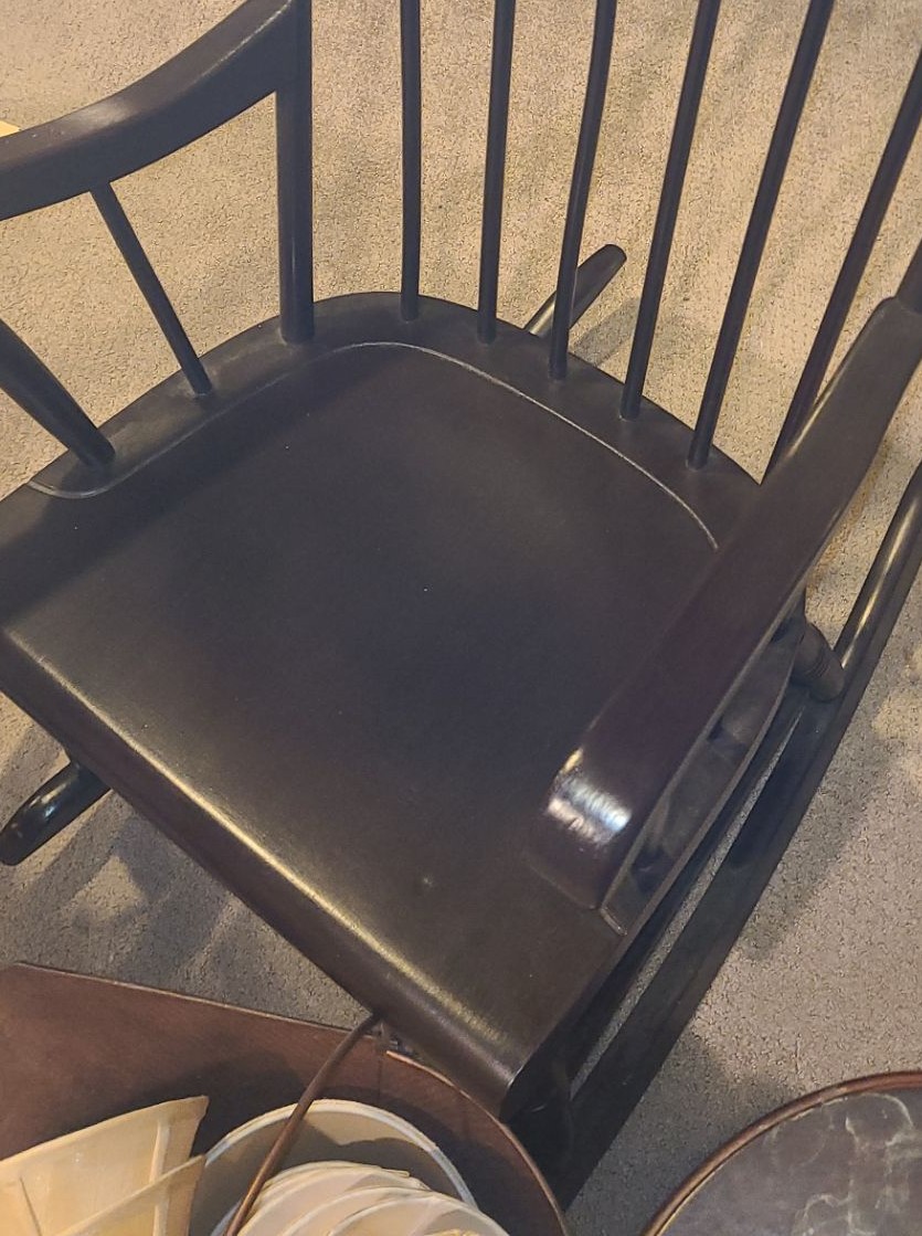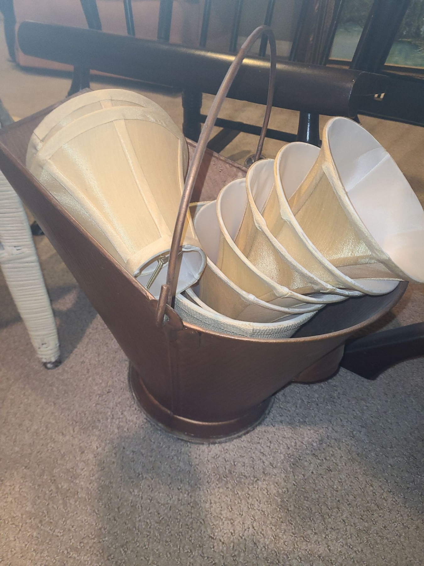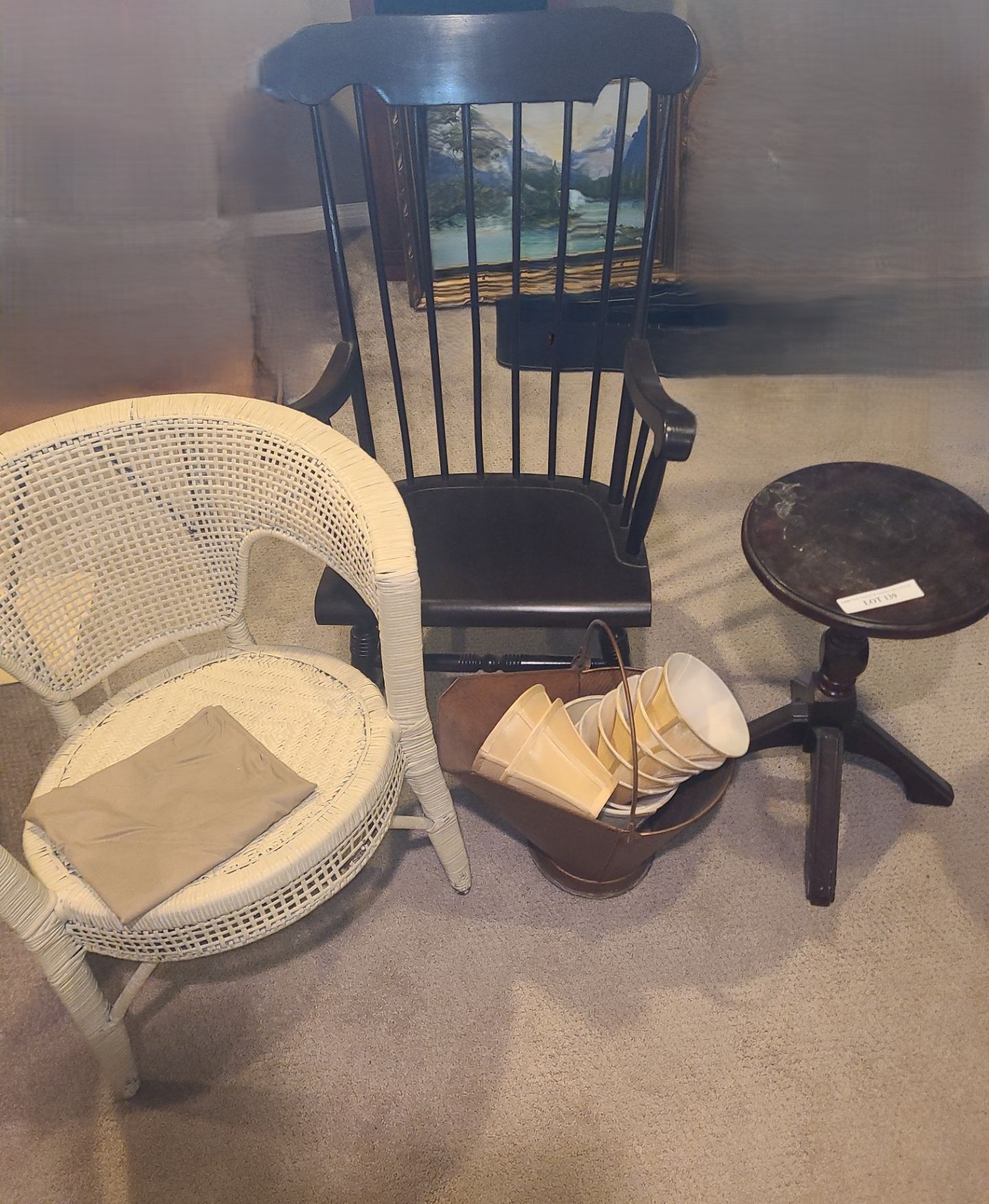 Lot 139 Wooden Rocking Chair 23 w 40 h, Wicker Chair, Wood Side Table, Copper Basket & Lamp Shades