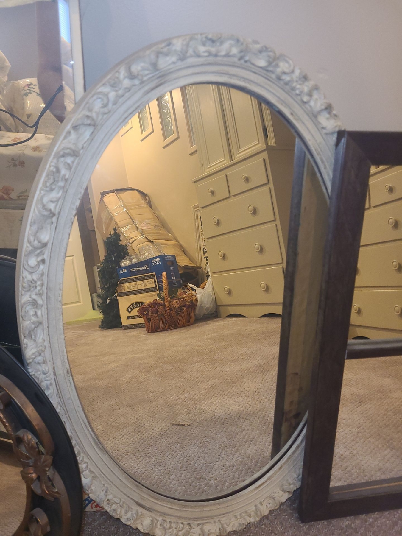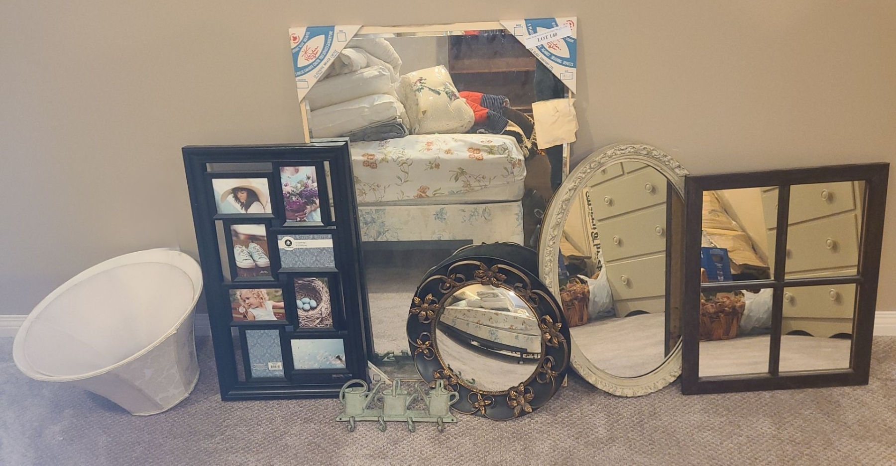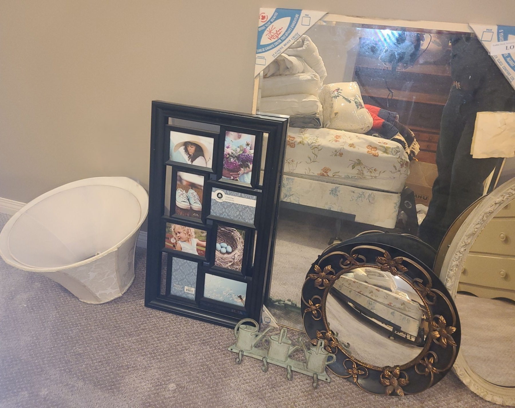 Lot 140 Assorted Mirrors, Collage Picture Frame, Lamp Shades & Metal Key Holder. Lg Mirror 24 W 36 H