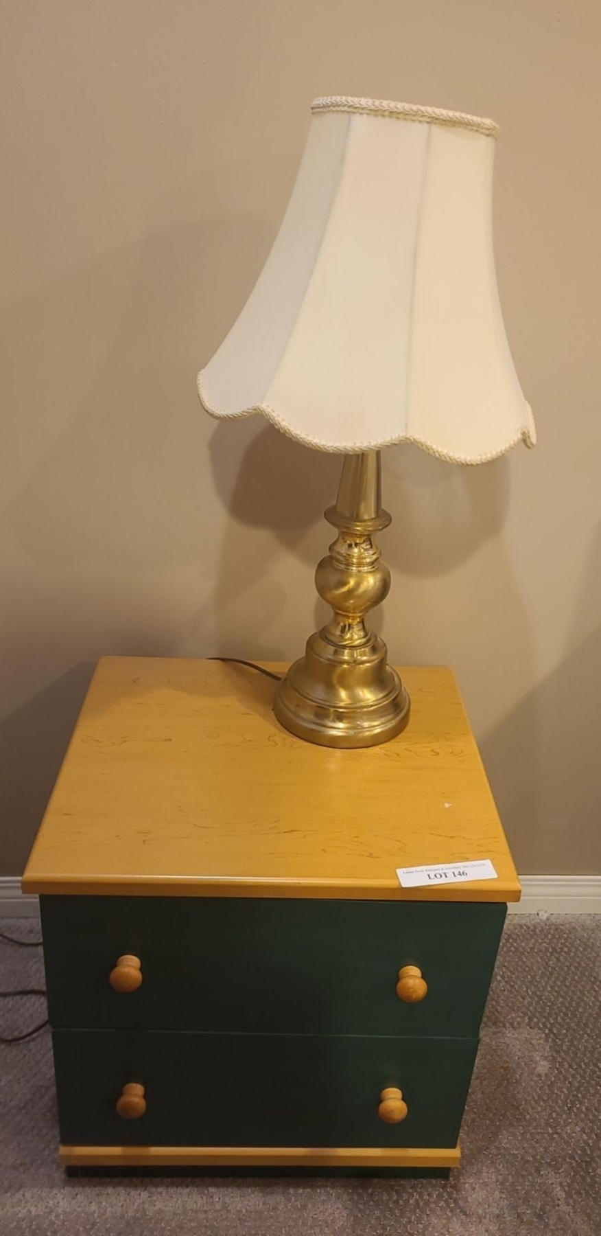 Lot 145 MDF 2 Drawer Nightstand 19 1/2 w20 1/2 h & Brass Lamp 27 1/2 h