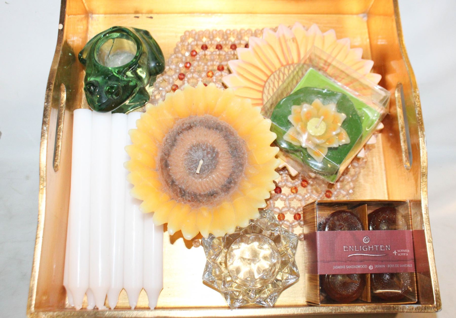 DECORATIVE TRAY W/ CANDLES/HOLDERS/MISC
