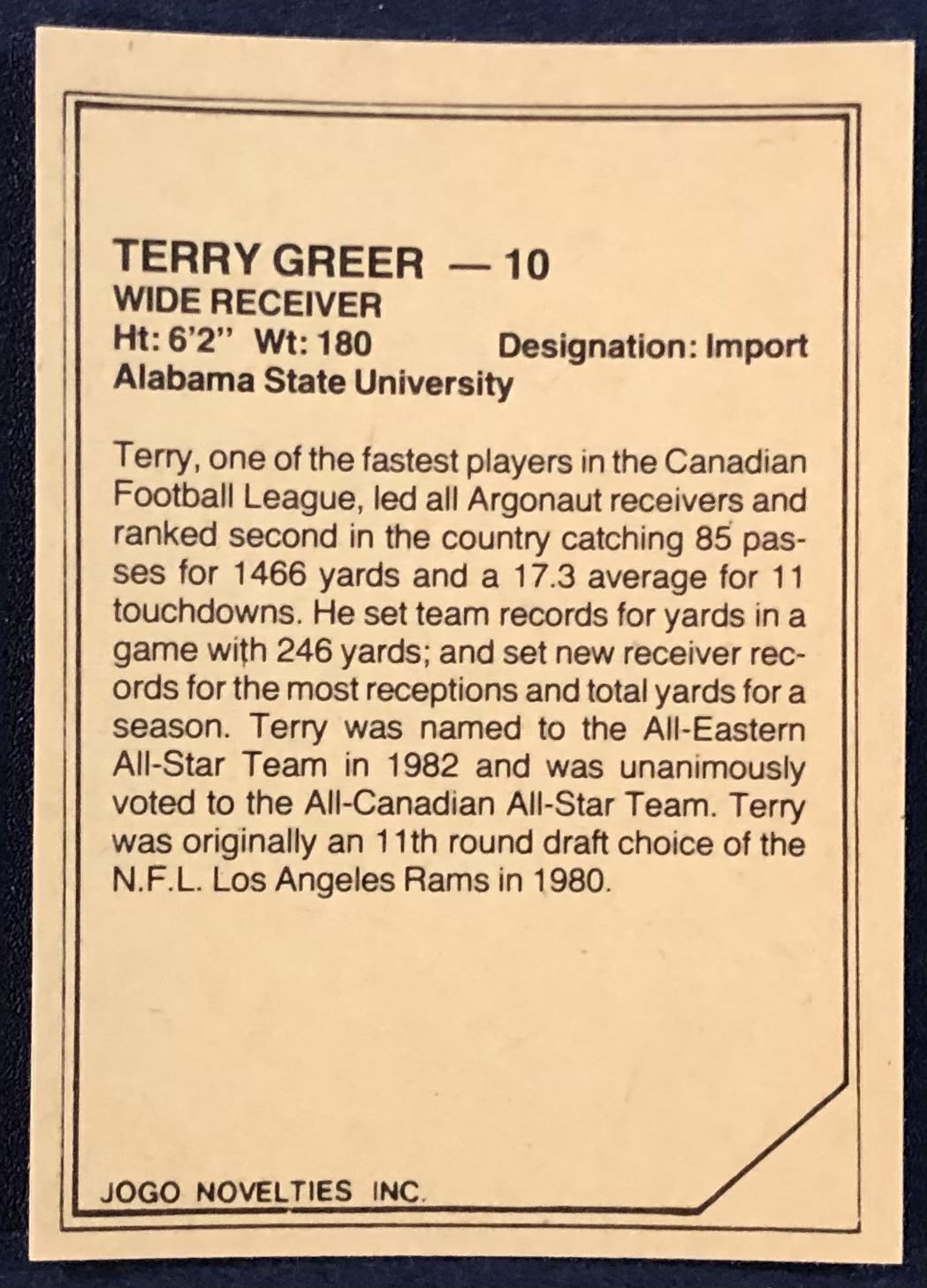 Lot 25 1984 JOGO CFL TERRY GREER (HOF)