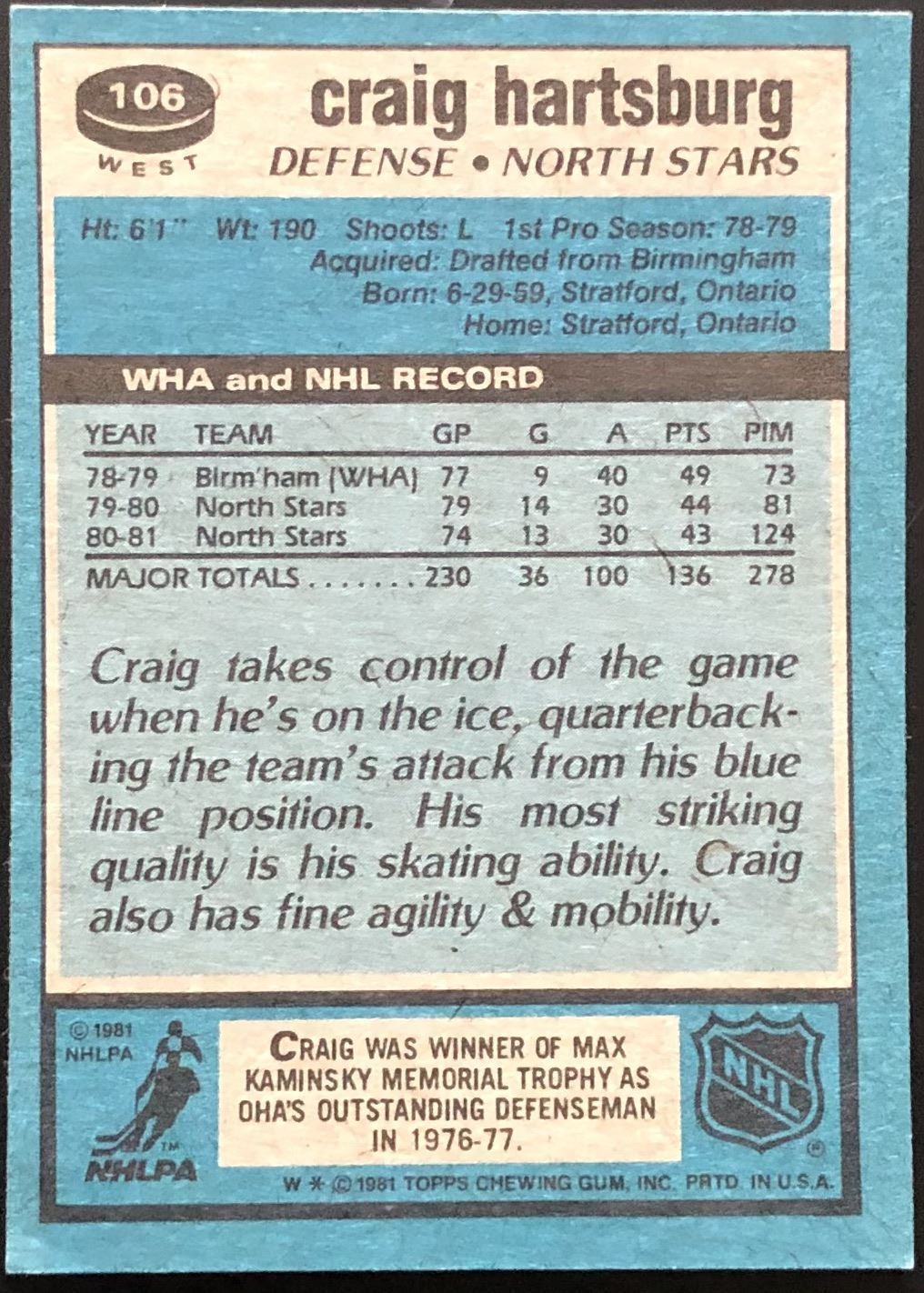 Lot 47 1981-82 TOPPS CRAIG HARTSBURG