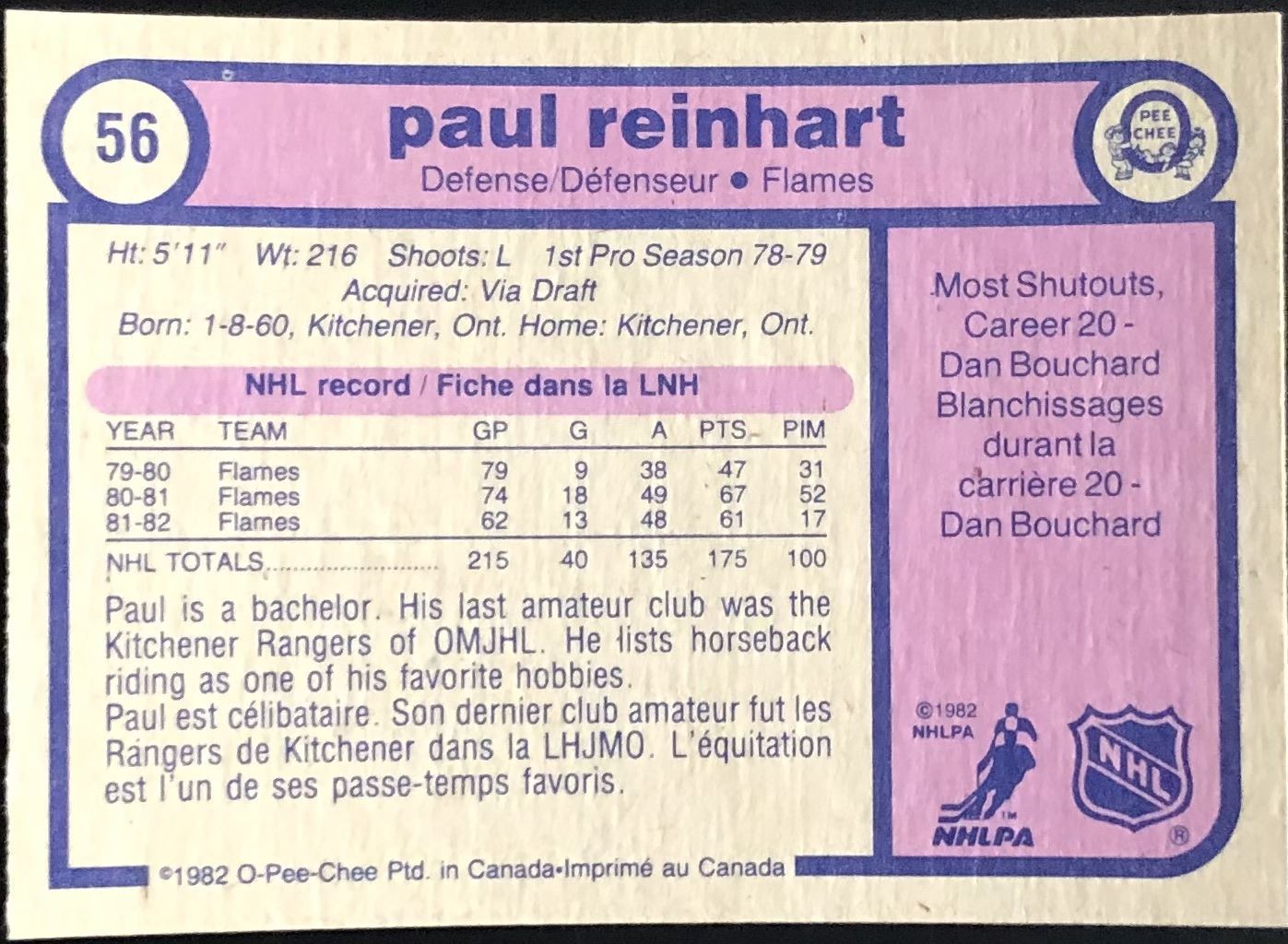 Lot 60 1982-83 O-PEE-CHEE PAUL REINHART