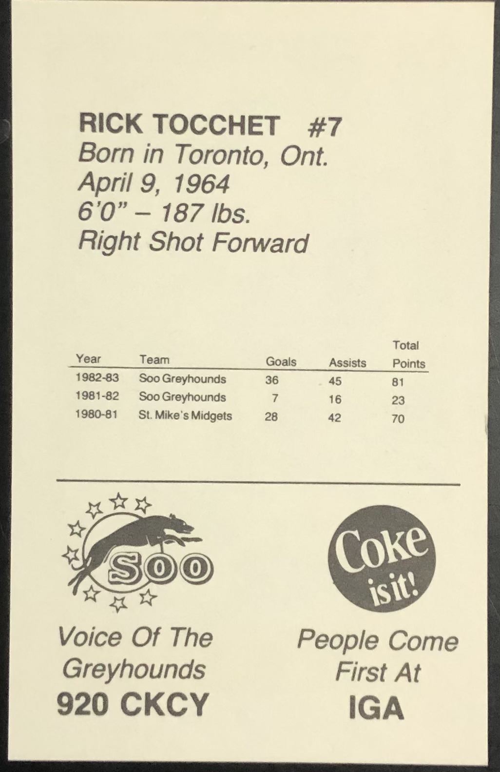 Lot 97 1983-84 JUNIOR CARD - RICK TOCCHET