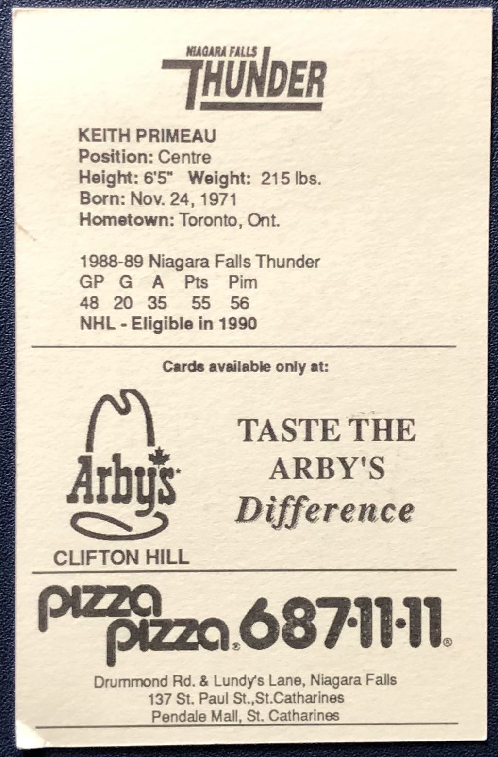 Lot 99 1989-90 NIAGARA FALLS THUNDER KEITH PRIMEAU POLICE ISSUE JUNIOR CARD