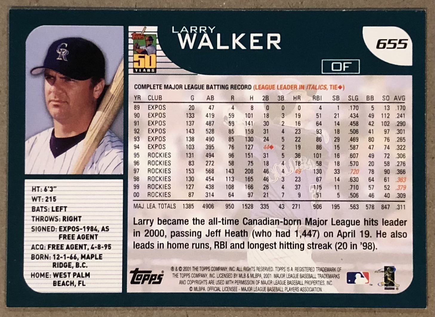 Lot 142 2001 TOPPS LARRY WALKER (HOF)