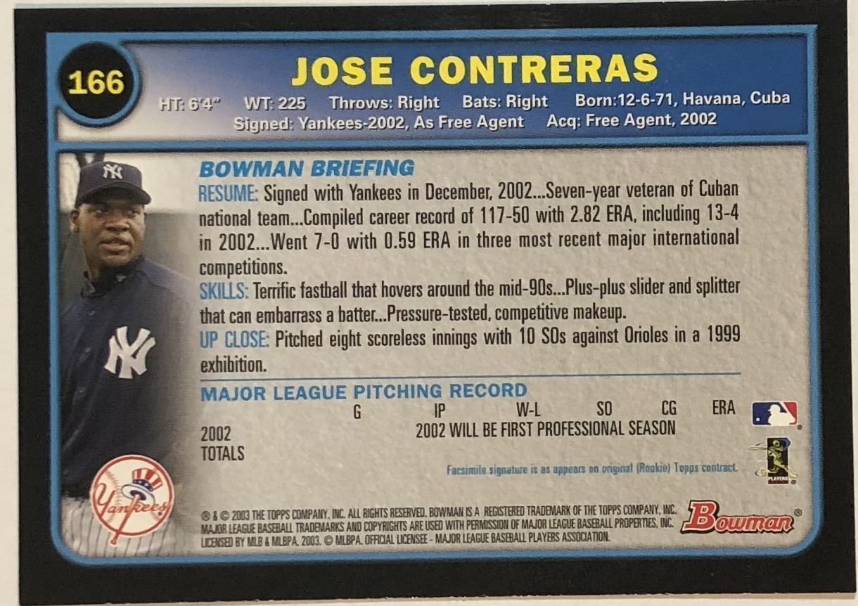 Lot 167 2002 TOPPS JOSE CONTRERAS ROOKIE CARD