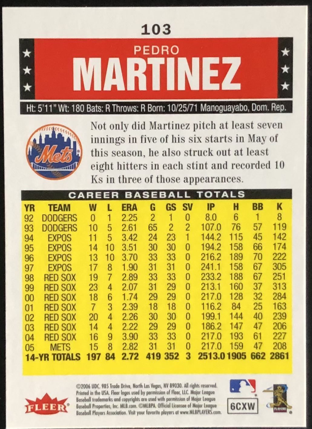 Lot 181 2006 FLEER PEDRO MARTINEZ (HOF)