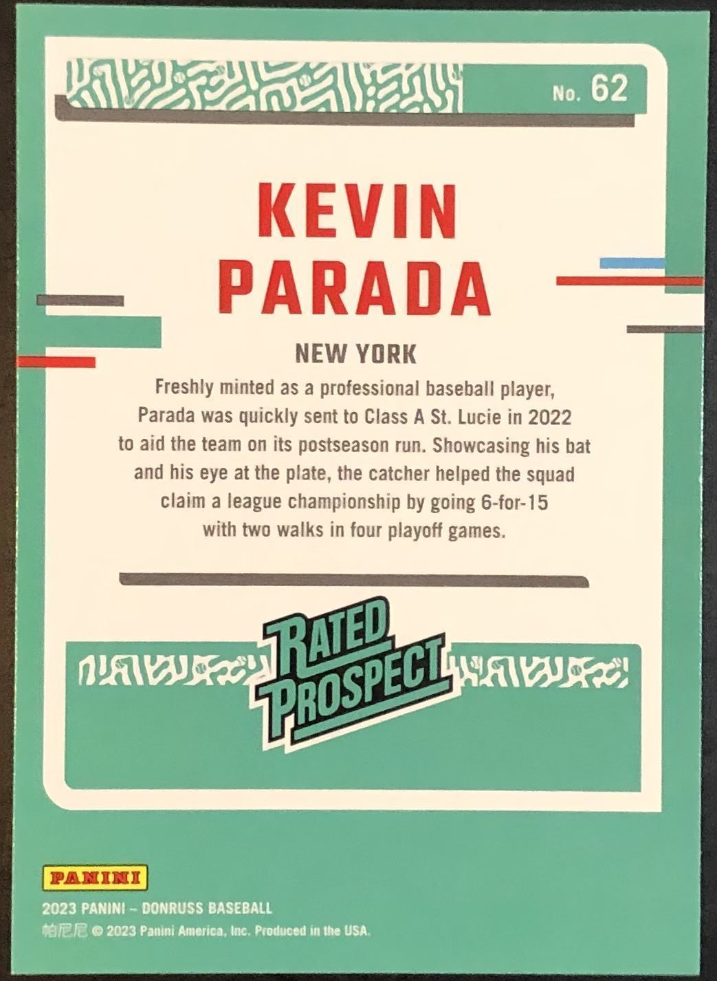 Lot 210 2023 DONRUSS KEVIN PARADA ROOKIE CARD