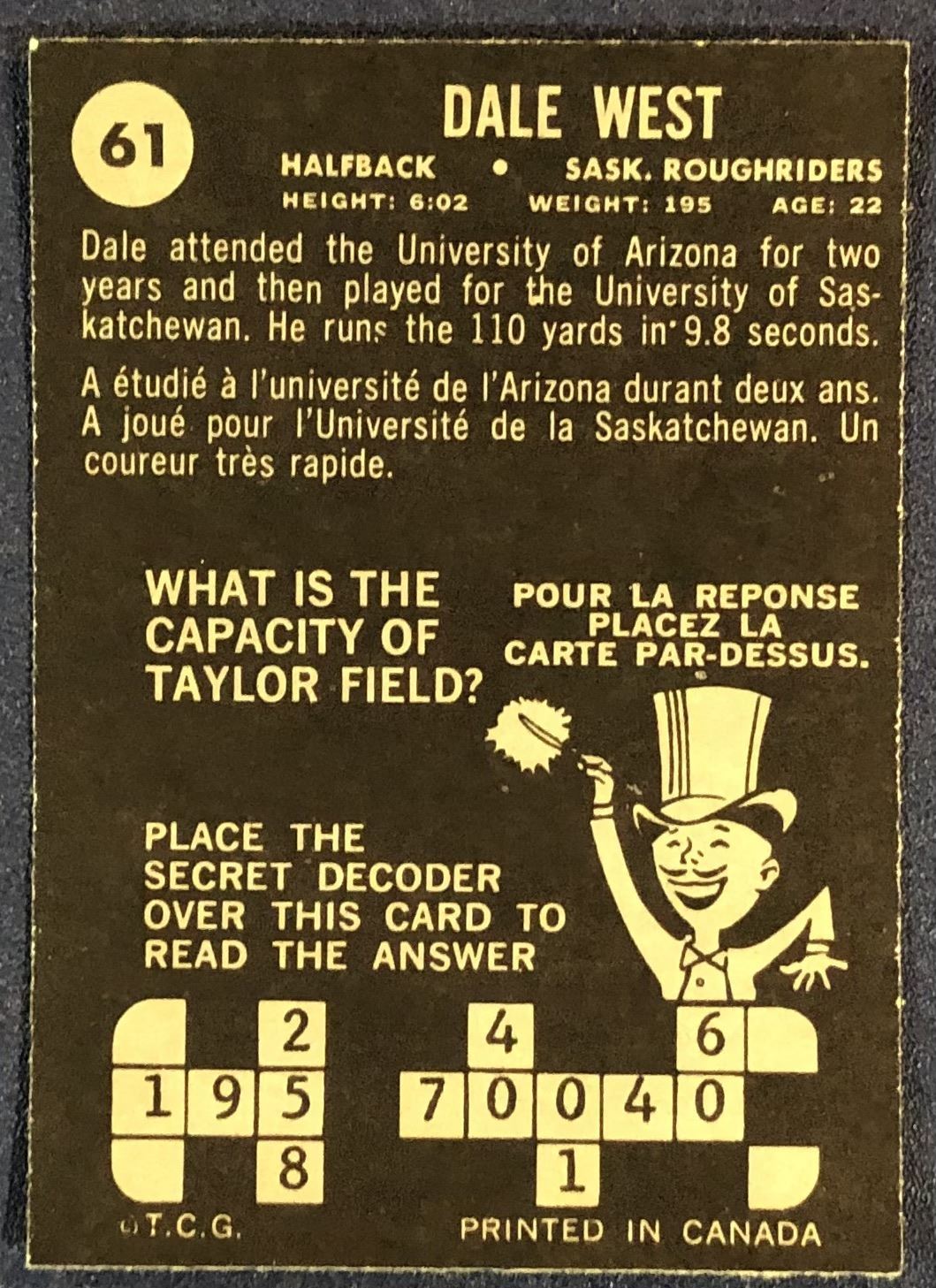 Card #61 CFL, football, vintage, OPC