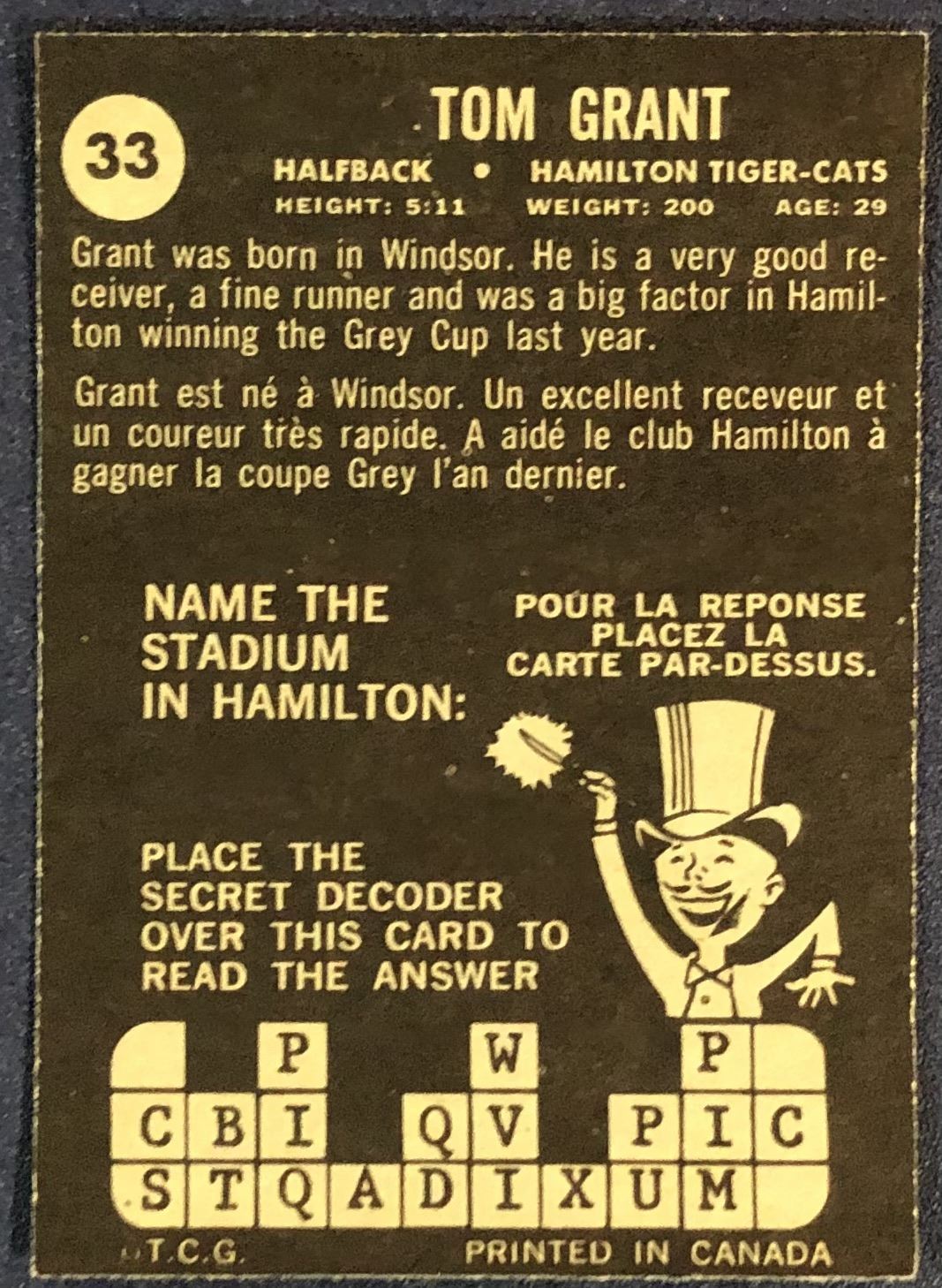 Lot 255 1964 O-PEE-CHEE CFL TOM GRANT (HOF)