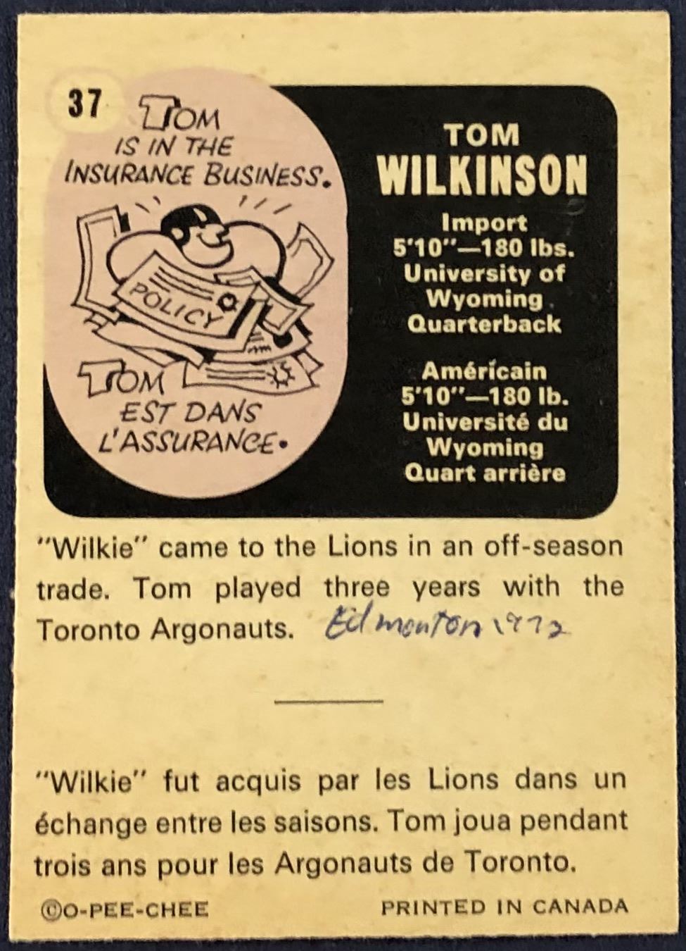 Lot 273 1971 O-PEE-CHEE TOM WILKINSON (HOF)