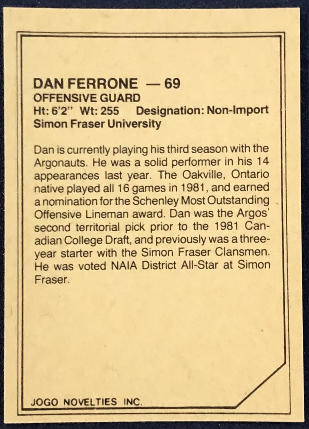 Lot 284 1984 JOGO CFL DAN FERRONE (HOF)