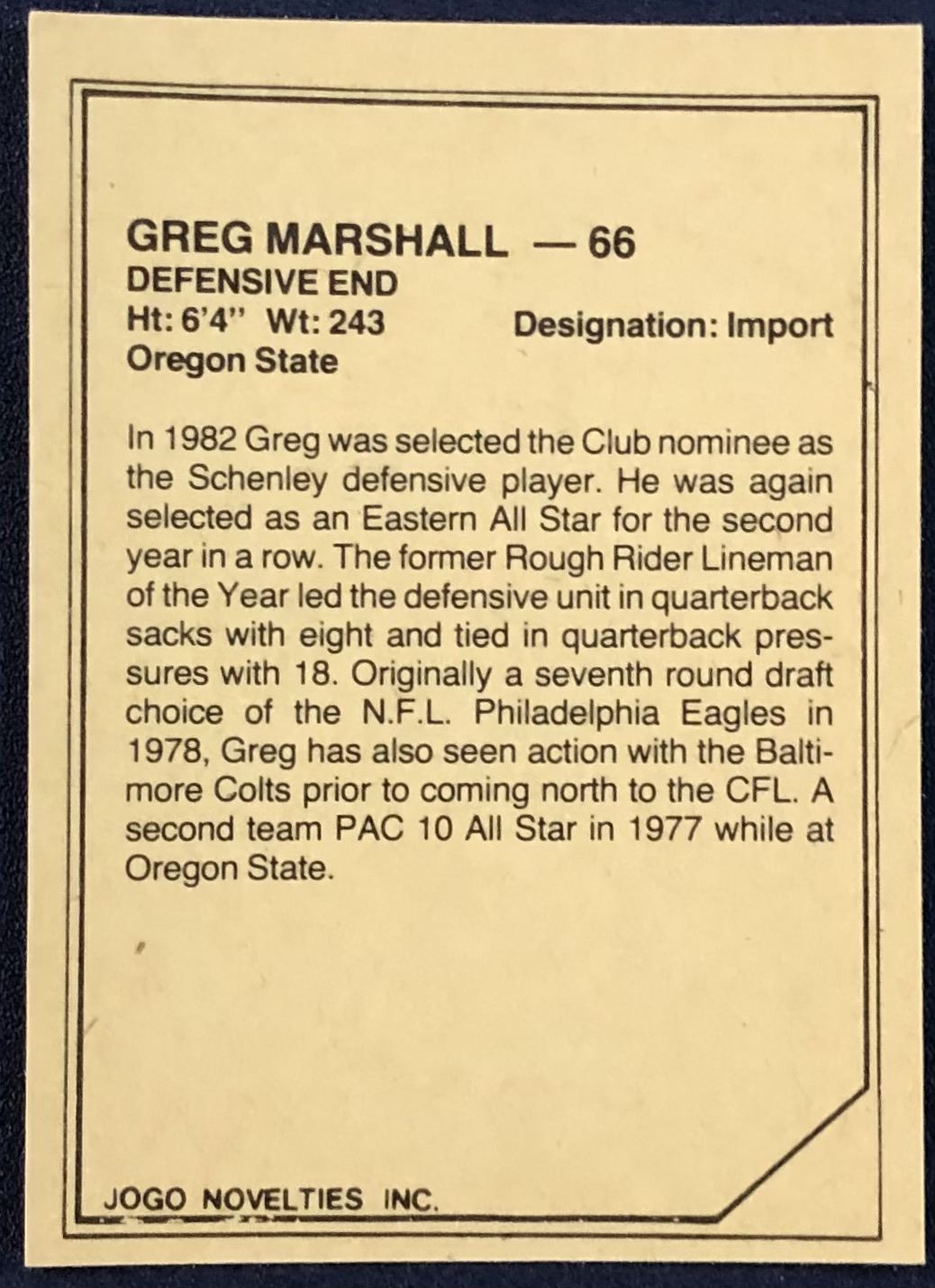 Lot 287 1984 JOGO CFL GREG MARSHALL