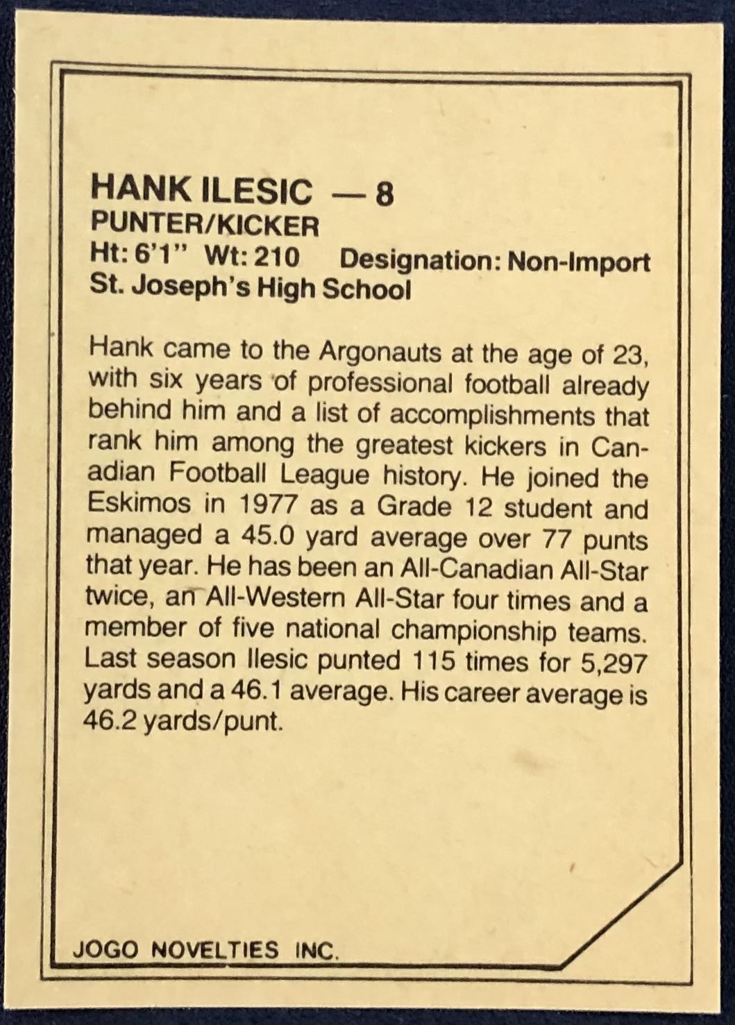 1984 JOGO CFL HANK ILESIC (HOF)
