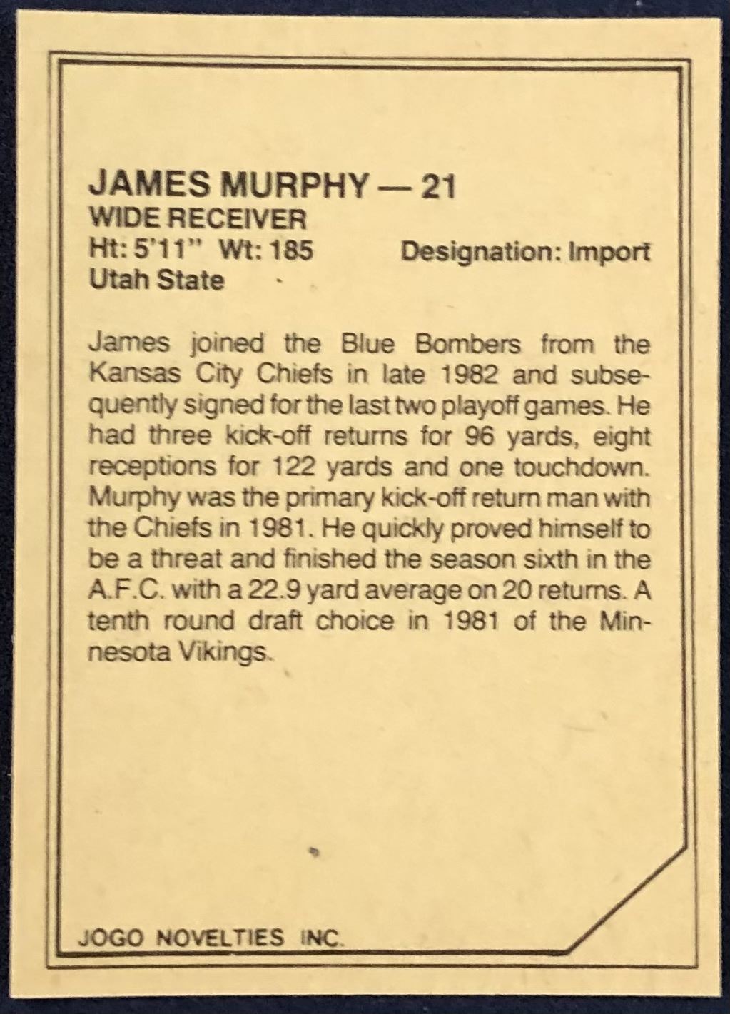 Lot 290 1984 JOGO CFL JAMES MURPHY (HOF)