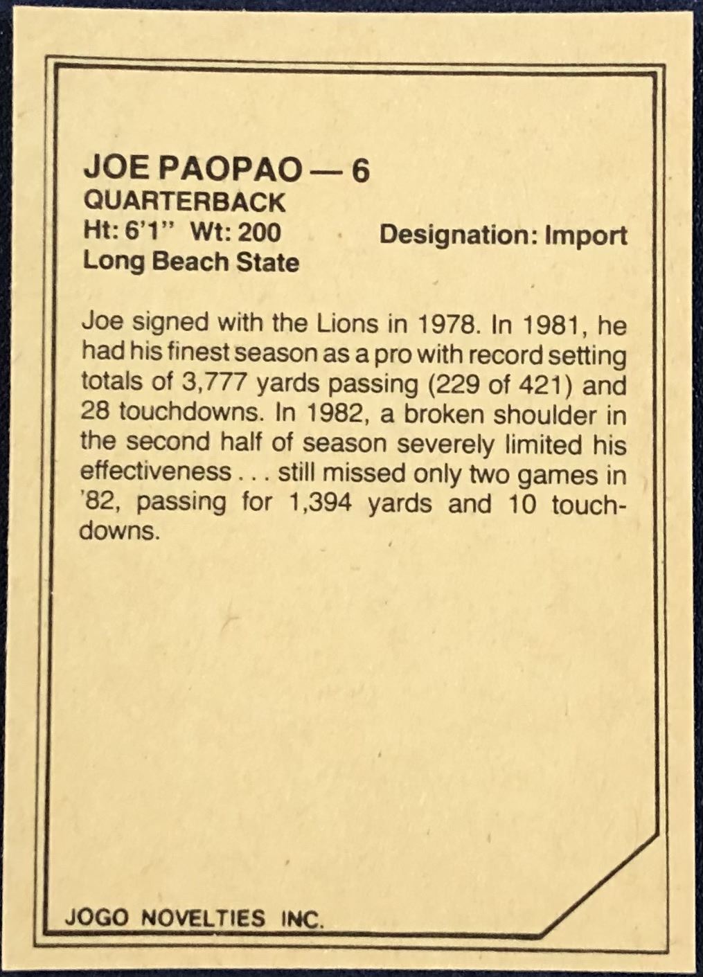 Lot 292 1984 JOGO CFL JOE PAOPAO