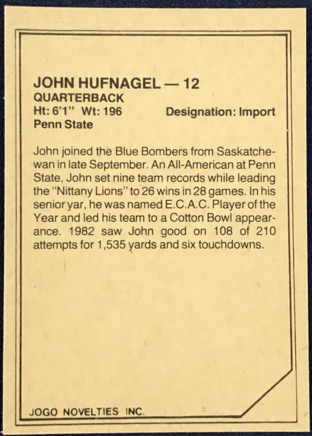 Lot 295 1984 JOGO CFL JOHN HUFNAGEL