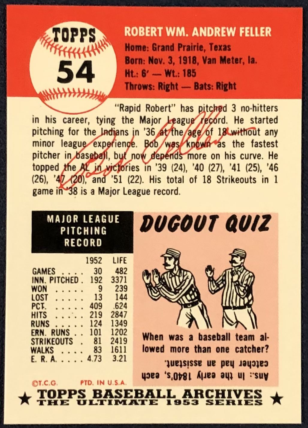 Lot 344 1991 TOPPS ARCHIVES (1953 SERIES) - BOB FELLER (HOF)