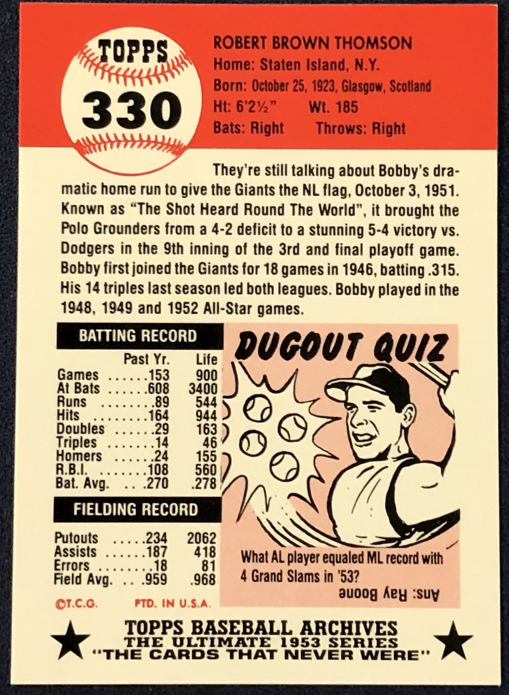 Lot 347 1991 TOPPS ARCHIVES (1953 SERIES) - BOBBY THOMSON