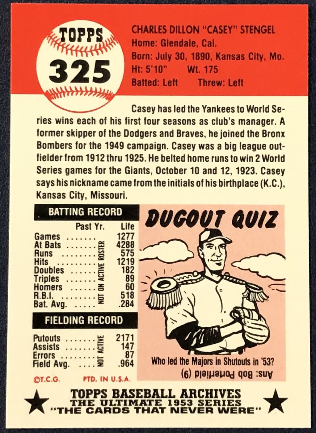Lot 348 1991 TOPPS ARCHIVES (1953 SERIES) - CASEY STENGEL (HOF)