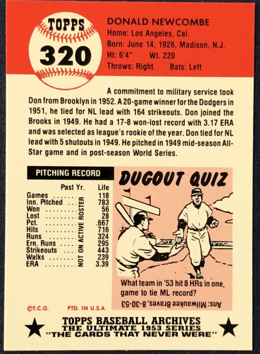 Lot 349 1991 TOPPS ARCHIVES (1953 SERIES) - DON NEWCOMBE (HOF)