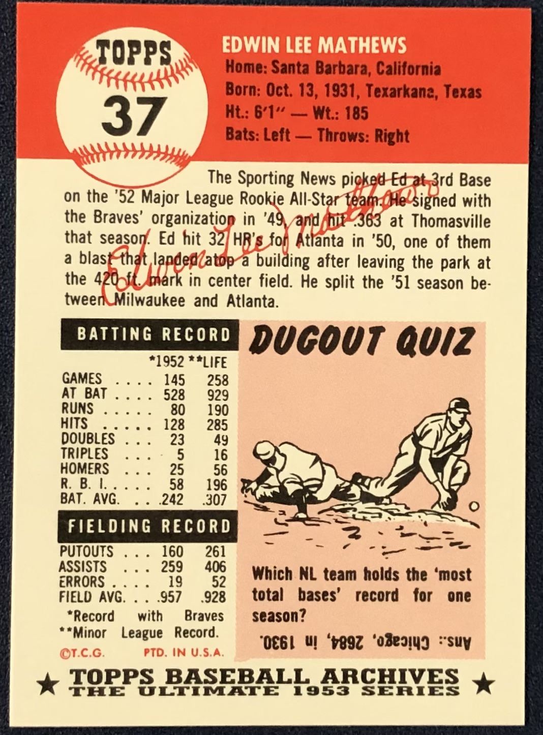 Lot 350 1991 TOPPS ARCHIVES (1953 SERIES) - EDDIE MATHEWS (HOF)