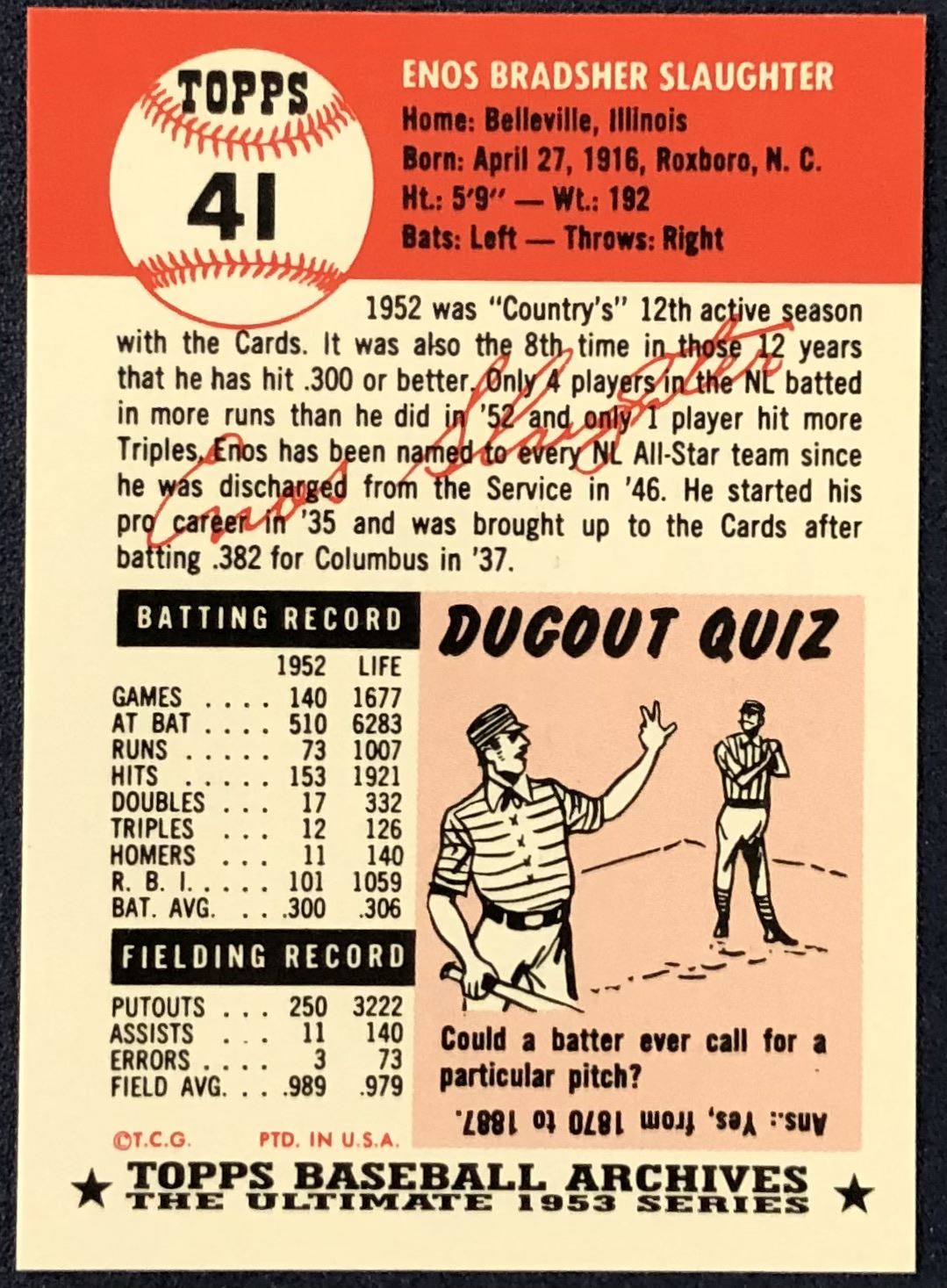 Lot 351 1991 TOPPS ARCHIVES (1953 SERIES) - ENOS SLAUGHTER (HOF)