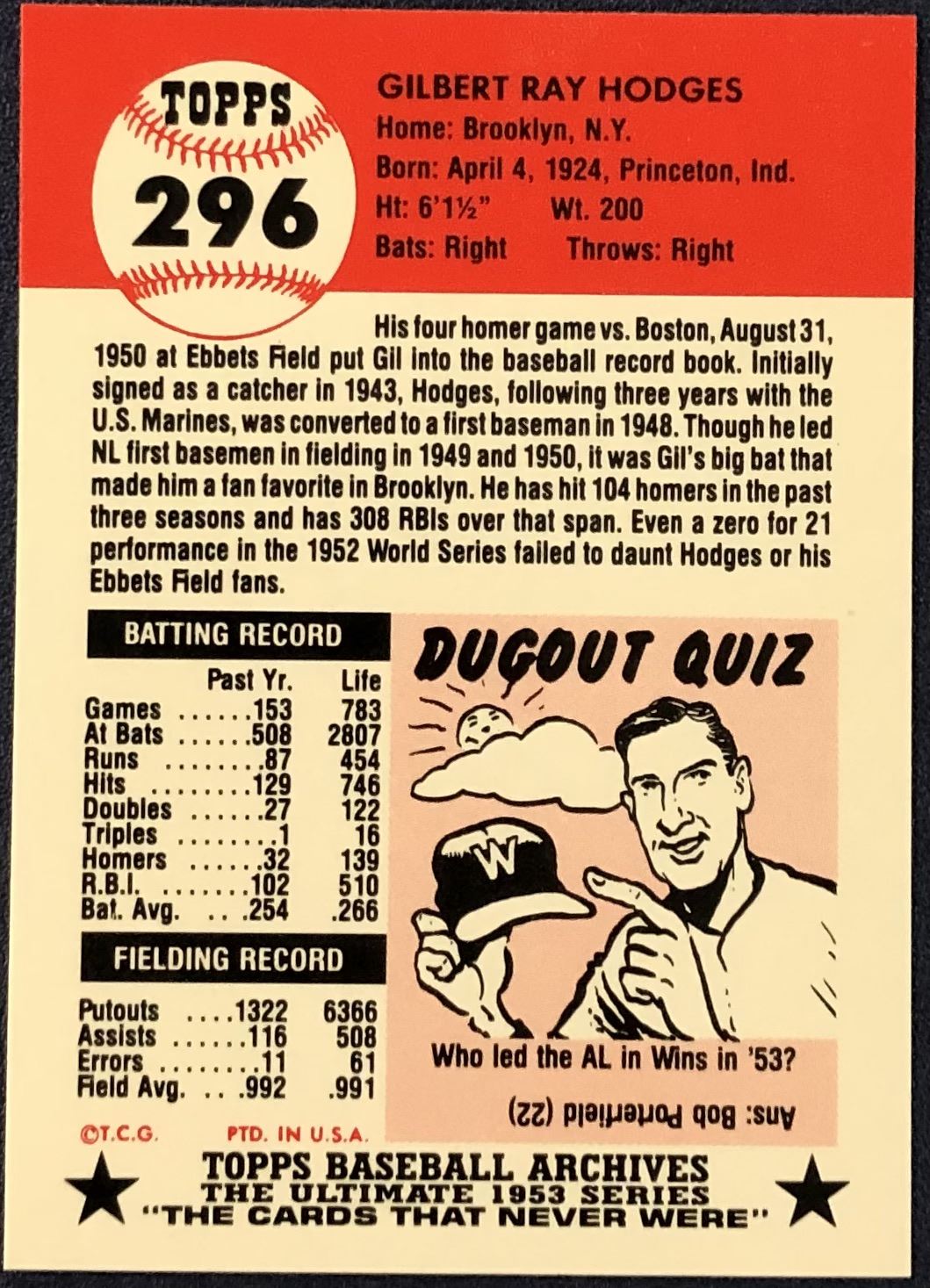 Lot 353 1991 TOPPS ARCHIVES (1953 SERIES) - GIL HODGES (HOF)
