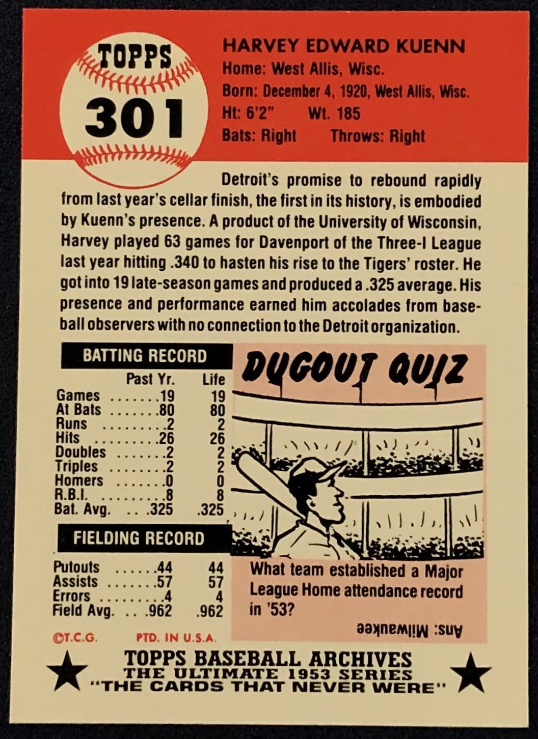 Lot 354 1991 TOPPS ARCHIVES (1953 SERIES) - HARVEY KUENN