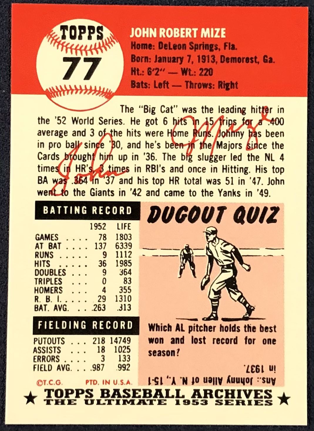 Lot 357 1991 TOPPS ARCHIVES (1953 SERIES) - JOHNNY MIZE (HOF)