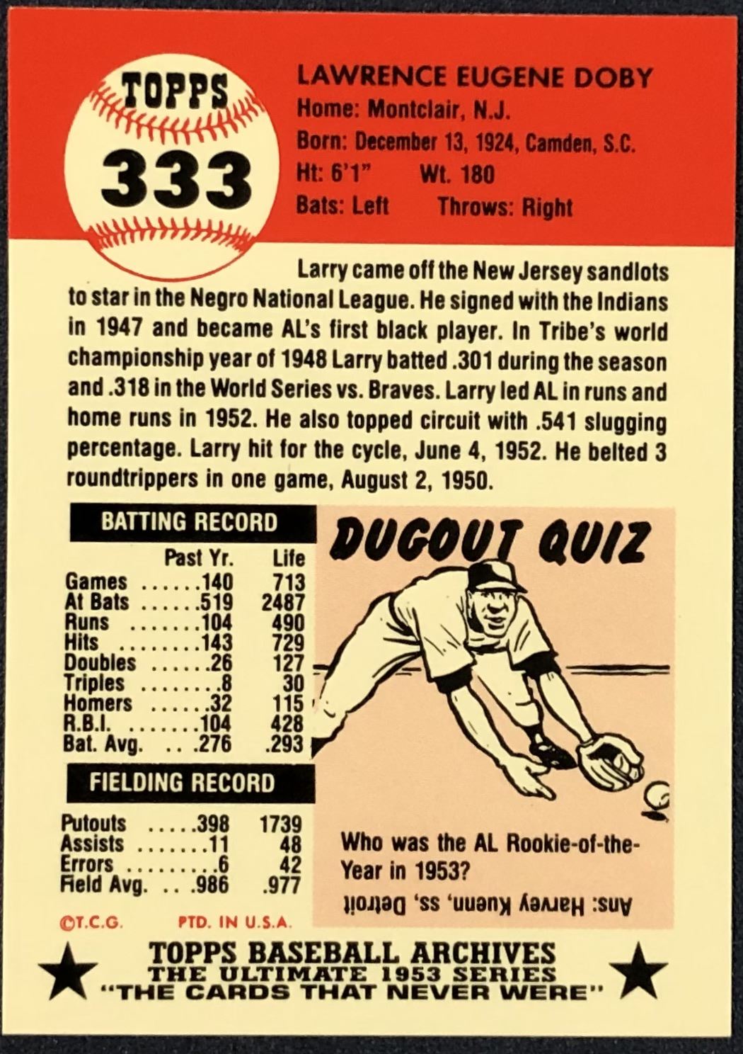 Lot 359 1991 TOPPS ARCHIVES (1953 SERIES) - LARRY DOBY (HOF)